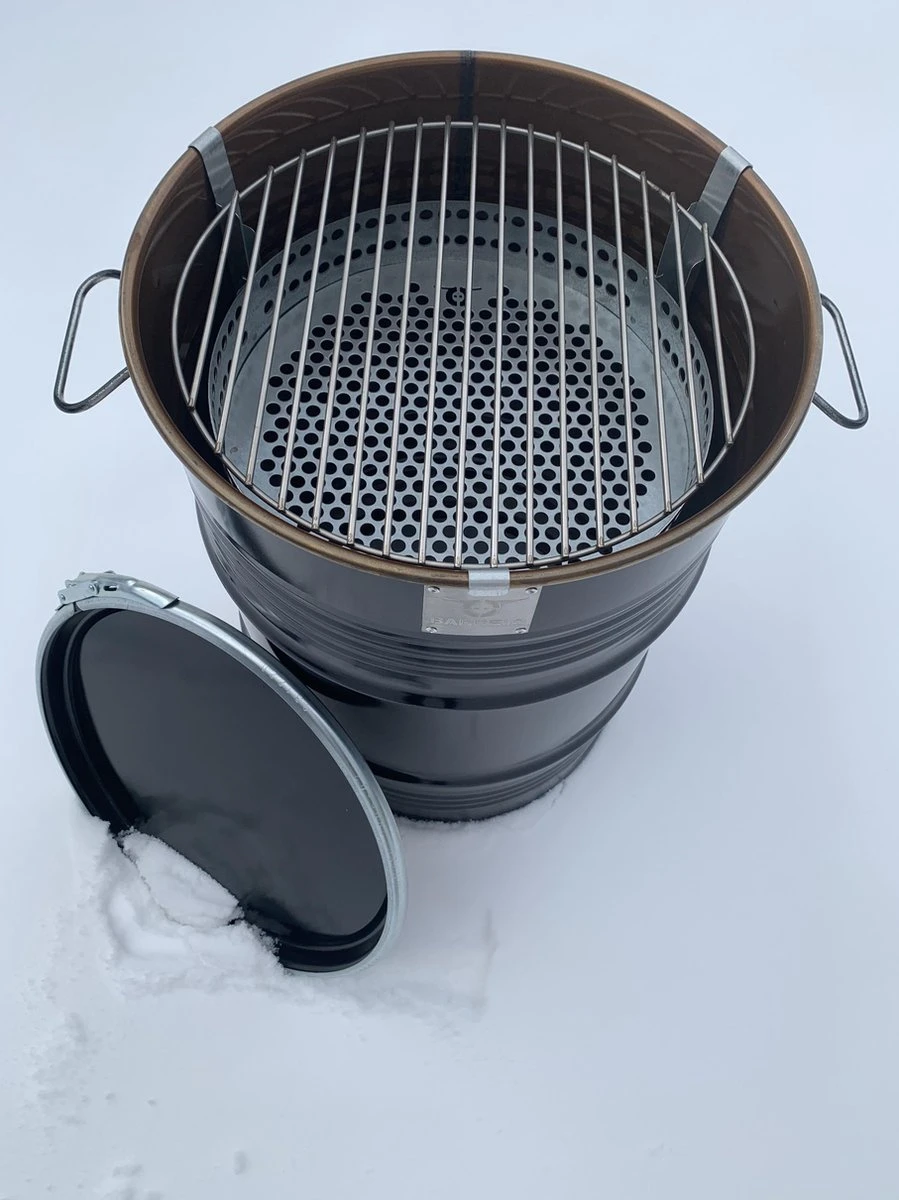 C’est un barbecue super convivial. Retirez le couvercle, jetez du charbon ou des briquettes dans le panier, vous les allumez, mettez le gril et vous pouvez BarrelQ! Et après le dîner, vous jetez du bois et vous avez un joli foyer pour vous détendre.