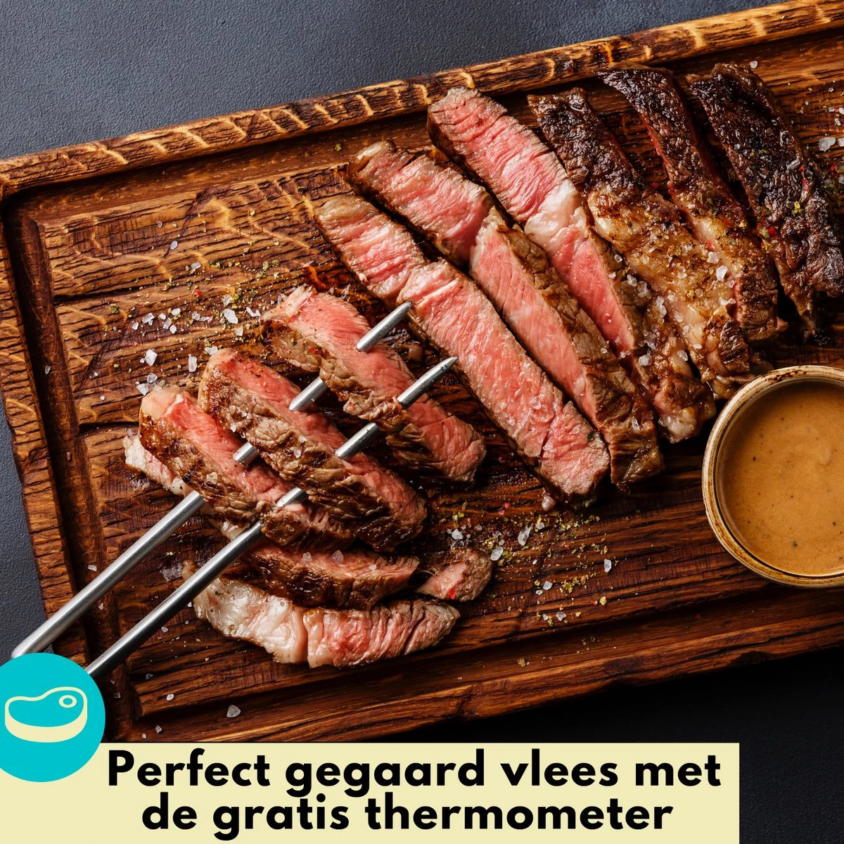 Rien n’est plus agaçant que la viande qui sort du barbecue noircie. Ou pire encore, votre viande est encore en partie crue, ce qui peut provoquer une intoxication alimentaire. Pour éviter cela, vous recevrez désormais temporairement un thermomètre pour barbecue à piles gratuitement avec votre commande. Le thermomètre a une plage de -50 à 300 degrés, vous êtes donc assuré de la bonne cuisson de votre viande.
