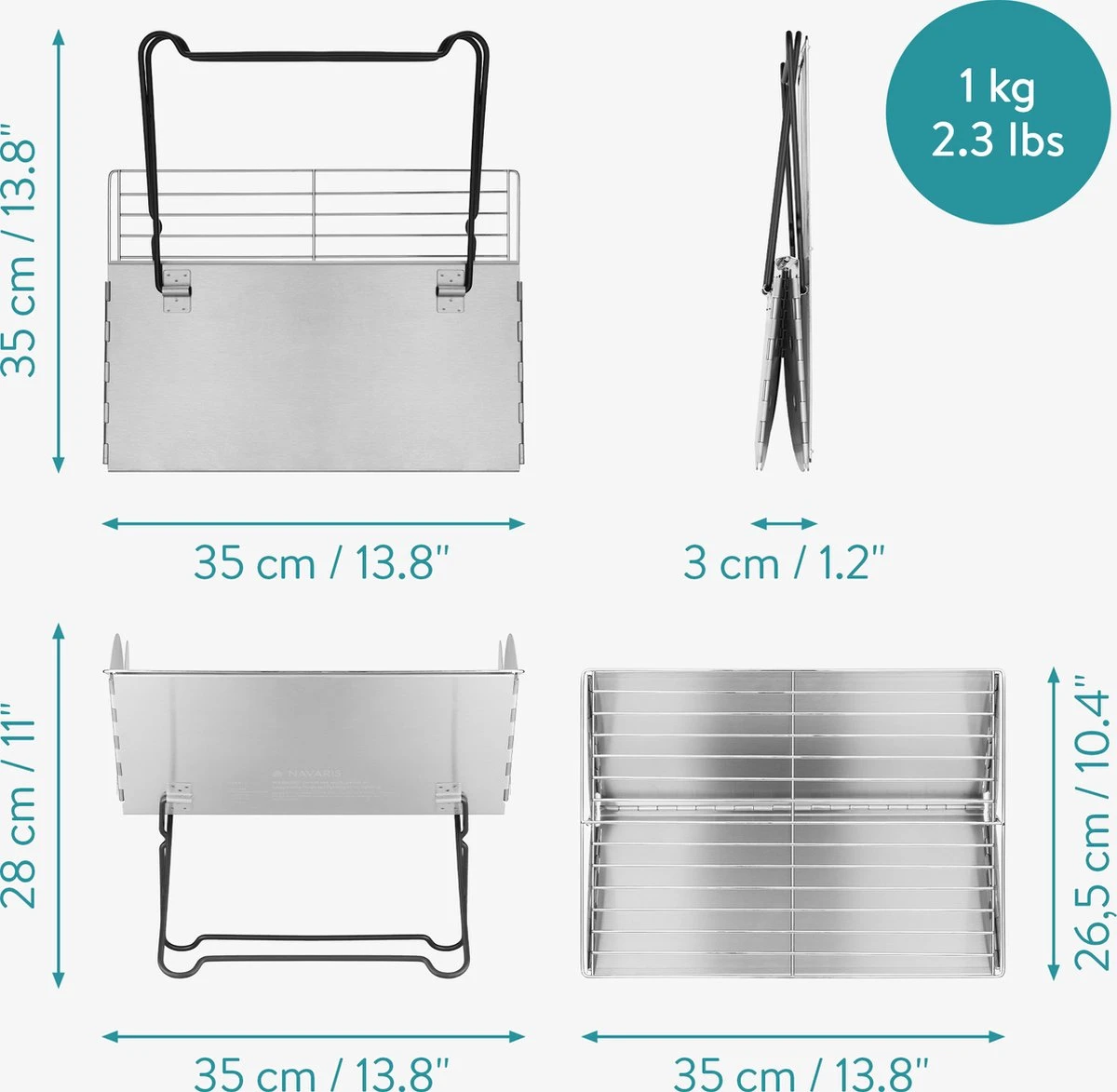 - DÉTAILS : Le barbecue en acier inoxydable de 0 mm d’épaisseur pèse 1,06 kg. Une fois déplié, il mesure 35 x 26,5 x 24,5 cm et vous pouvez le plier de manière compacte jusqu’à 35 x 25 x 3 cm. La grille du gril mesure 34. x 25,2 cm.