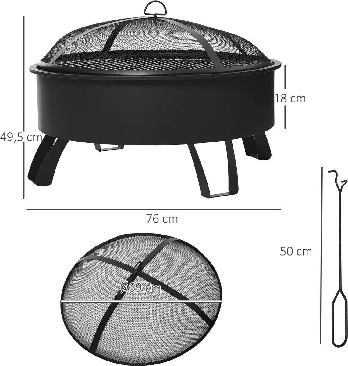 Couleur : noir Matériau : acier Dimensions hors tout : 76 x 49,5 h cm, taille du couvercle en maille : 69 cm Taille de la grille en maille : 68 cm Taille du tisonnier : 50 lx 5 w cm Profondeur du bol : 18 cm Certification : LFGB · Étiquette de l’article : 842-177 · REMARQUE : Ne pas utiliser à la maison, sur une terrasse en bois ou sur une surface combustible telle que de l’herbe, des feuilles, etc.