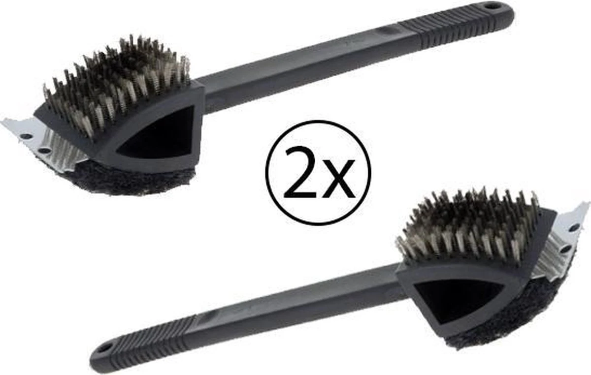 Ensemble de 2 brosses à barbecue. Au bout de la brosse se trouve un grattoir qui peut être utilisé pour enlever la saleté collée. En plus de la brosse et du grattoir, il y a aussi un tampon à récurer pour enlever la saleté.