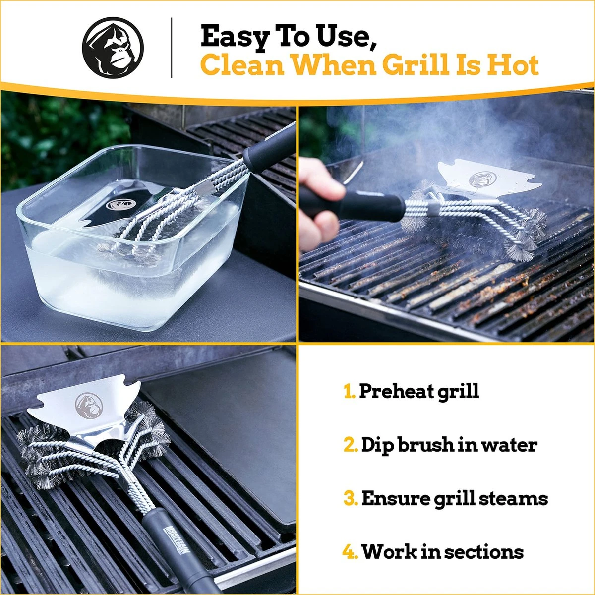 La brosse à barbecue en acier inoxydable que vous attendiez ! Geen de trucs collants désagréables sur le gril qui peuvent enflammer et brûler la viande. Ces taches rendent impossible de si beaux motifs en damier sur la viande grillée !. Avec notre brosse à gril, vous pouvez passer plus de temps sur votre viande et moins de temps à nettoyer ! Cette brosse pour gril a des poils intelligemment conçus et de haute qualité et un grattoir qui peut atteindre les parties les plus inaccessibles du gril et les nettoyer en un tournemain. Oubliez les longues heures de récurage grâce à notre brosse métallique unique !