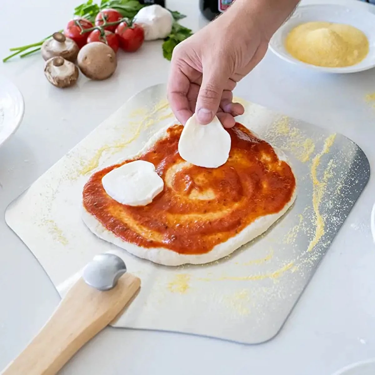Ces 2 pelles à pizza sont fabriquées avec les matériaux les plus résistants. À travers leconceptions mentir leoutils à pizza bien en main. La pelle à pizza est en aluminium solide et possède un manche en bois. Avec la pelle à pizza de By mouna vous glissez dans une pizzaun mouvement sur votre pierre à pizza et retirez-la à nouveau sans vous brûler les mains.