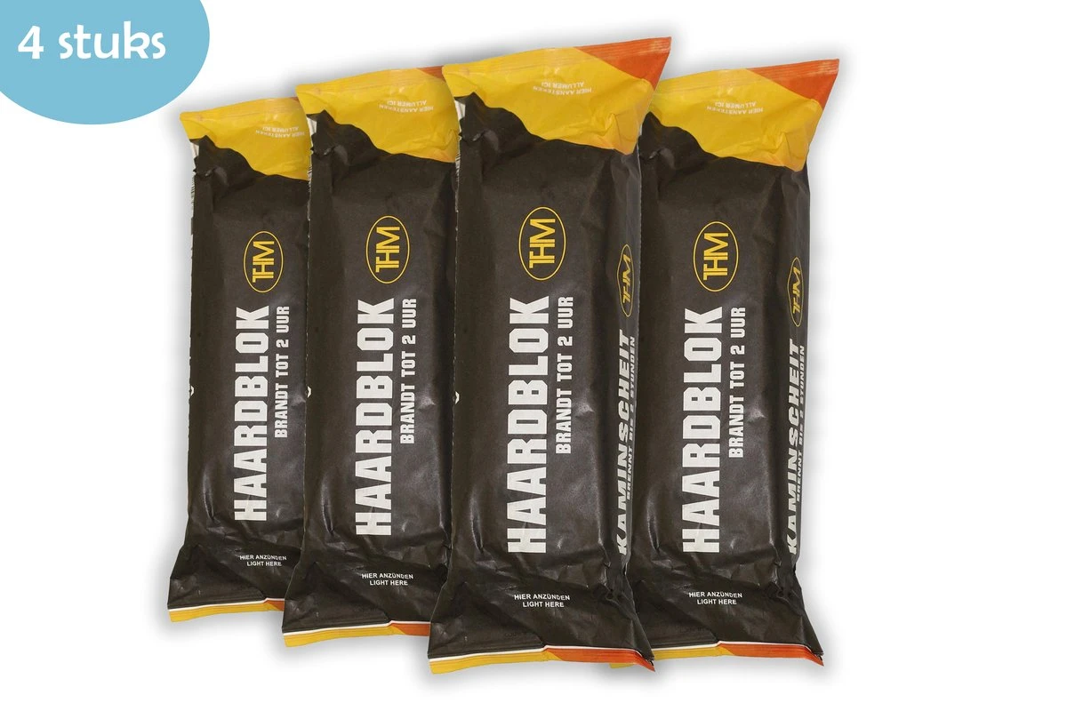 cheminée bûche 4 pièces. Idéal pour une cheminée et un foyer. Brûle plus longtemps et mieux que le bois normal. Facile à allumer: allumez les 2 extrémités et le foyer s’allumera automatiquement. La bûche a une durée de combustion de 2 à 3 heures.