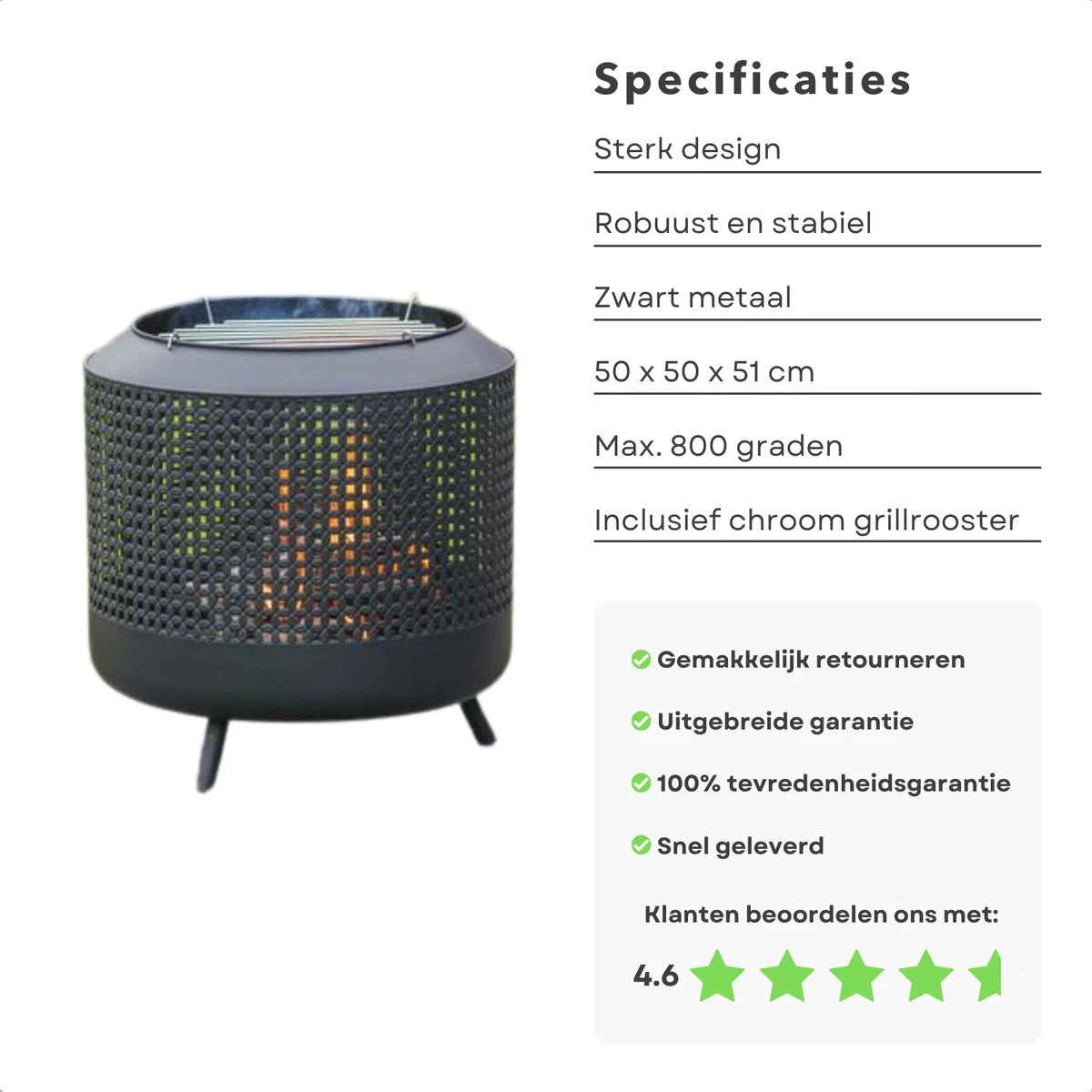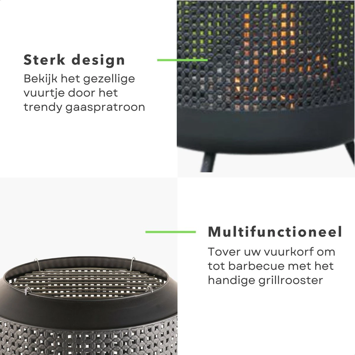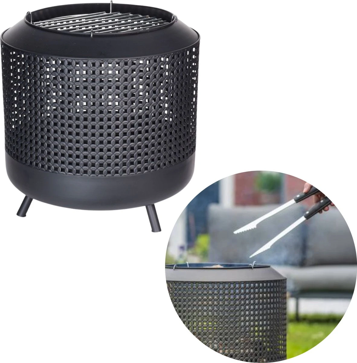 Avec ce foyer multifonctionnel, vous pouvez griller sur le barbecue, rôtir à la broche ou simplement profiter d’un feu chaud. Le moyen idéal pour profiter de votre jardin toute l’année ! Fabriqué en métal robuste, ce foyer est robuste et stable. Avec une hauteur de 51 cm et un diamètre de 50 cm, il est parfait pour tout espace extérieur.