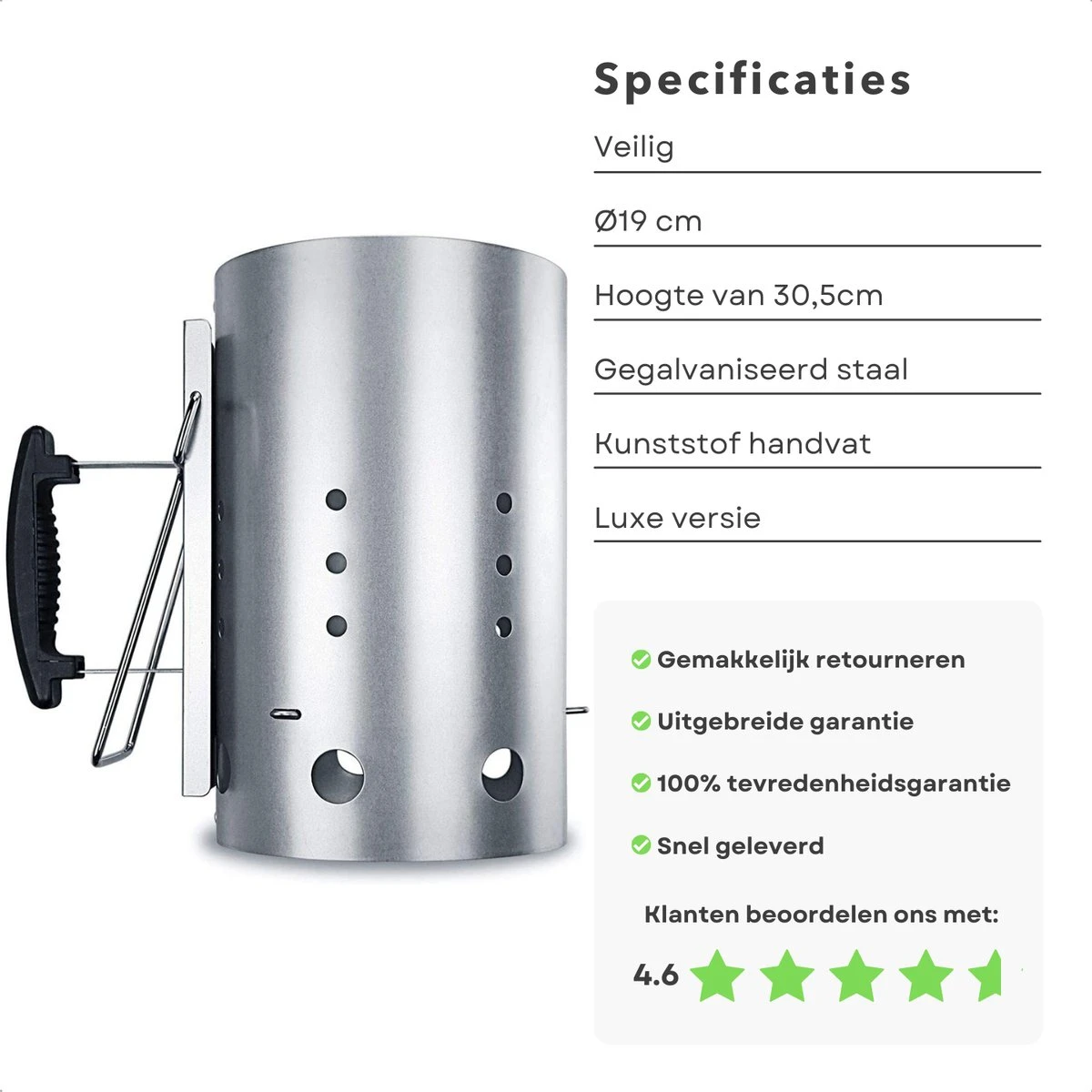 Le Cheqo® Luxe Briquette Starter a un diamètre de 19 cm et une hauteur de 30,5 cm. Cela signifie qu’il y a suffisamment de charbon de bois ou de briquettes dans le démarreur pour la plupart des barbecues et feux de camp à la fois.