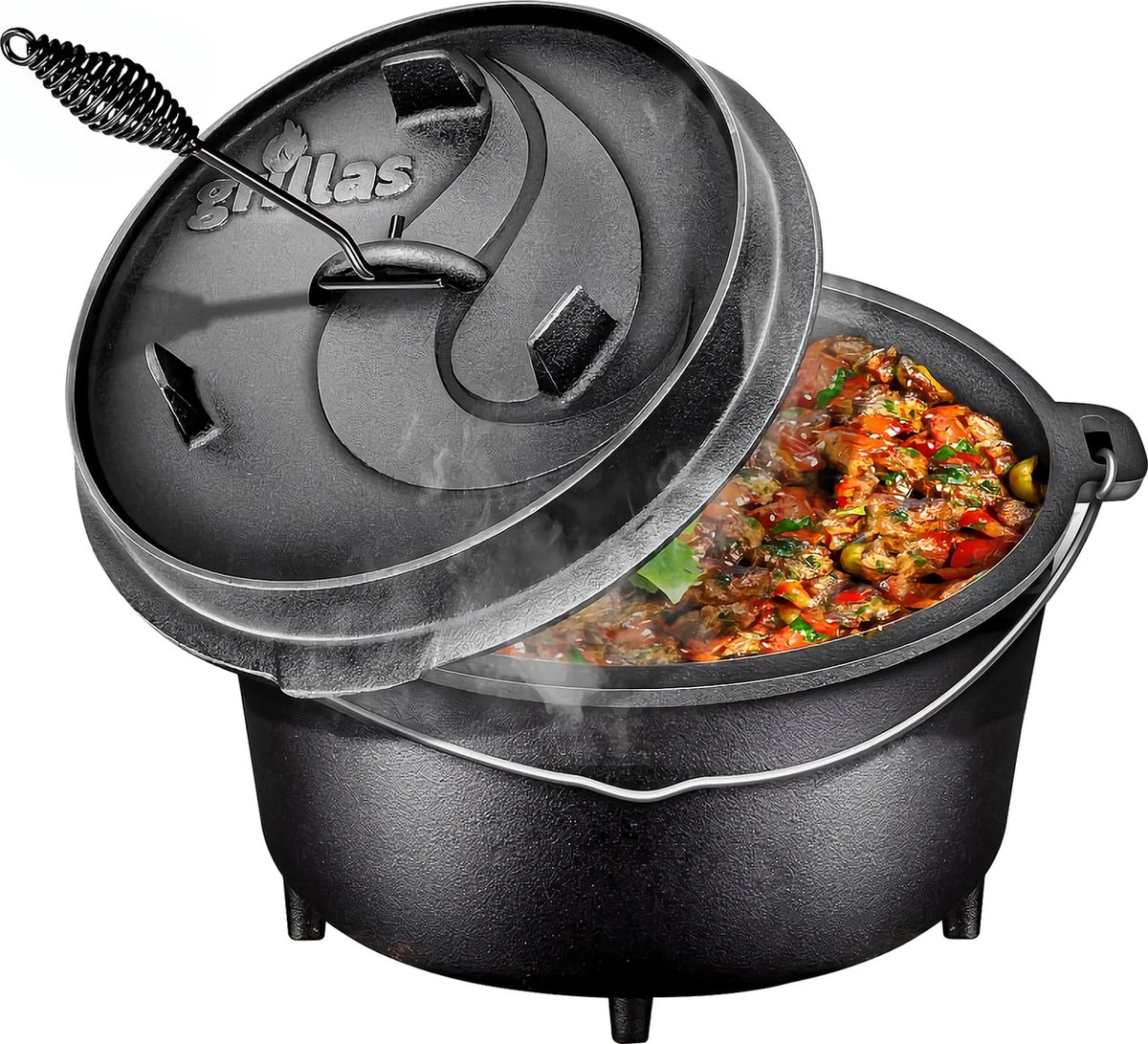 Descriptiongrillas® Dutch Oven Set |déjà brûlé| Casserole en fonte Cocotte en fonte I avec lève-couvercle et poignée Le Dutch Oven est une marmite traditionnelle en fonte à paroi épaisse avec un couvercle parfaitement ajusté.Utilisez le Dutch Oven pour cuisiner, rôtir, braiser, rôtir, cuire à la vapeur et cuire au four. Perfect pour le foyer, le BBQ ou le feu de camp. Grâce au matériau indéformable et de haute qualité, la marmite à goulache offre une très longue durée de vie. Le bord biseauté et la surface de contact du couvercle doivent être mis en valeur. Cela garantit une chaleur encore plus élevée grâce à une étanchéité parfaite. Cet ensemble de bouilloire à feu haut de gamme comprend un lève-couvercle assorti et un livre de recettes avec des recettes utiles. Le couvercle peut également être utilisé à l’envers avec ses pattes comme casserole ou plat de service. Le four hollandais est facile à transporter grâce à la poignée. Les fours hollandais à grillas sont déjà assaisonnés et peuvent être utilisés immédiatement. La température peut être contrôlée à tout moment via le bus du thermomètre. Points forts :- Reeds cuit – Série Premium- Très haute qualité-Surface meulée-Peut être utilisé immédiatement-Couvercle avec pieds (peut être utilisé à l’envers comme casserole)-Poignée avec encoche pour accrocher–Avec poignée de transport pratique-Four hollandais inclus lève-couvercle-Marmite et couvercle avec passage de thermomètre-Utilisation universelle comme cocotte, marmite, poêle à griller, poêle, marmite à goulacheAccessoires : -Four hollandais-Poignée avec variantes de lève-couvercle à encoche : Article : 4,2 litres / 4,5 QT- Nombre de personnes : 2 – 5 personnes – Contenance (totale) : 4,2 litres – Contenance (pot) : 3,1 litres – Contenance (couvercle) : 1,1 litre – Diamètre intérieur : 23,5 cm – Hauteur intérieure : 9,5 cm – Poids : 6,7 kg Article : 7,3 litres / 6 QT – Nombre de personnes : 4 – 8 personnes – Volume (total) : 7,3 litres – Volume (pot) : 5,5 litres – Volume (couvercle) : 1,8 litre – Diamètre intérieur : 29,5 cm – Hauteur intérieure : 9,5 cm – Poids : 9.0 kg Article : 9 litre / 9 QT – Nombre de personnes : 8 – 0 personnes – Volume (total) : 9.0 litre – Contenance (pot) : 7.2 litres Contenance (couvercle) : 1,8 litres – Diamètre intérieur : 29,5 cm – Hauteur intérieure : 13 cm – Poids : 0 kg Article : 13,6 litres / 12 QT- Nombre de personnes : 14 – 20 personnes – Contenu (complet) : 13,6 litres – Contenance (pot) : 10,7 litres – Contenance (couvercle) : 2,9 litres – Diamètre intérieur : 34,5 cm – Hauteur intérieure : 13,0 cm – Poids : 0 kg