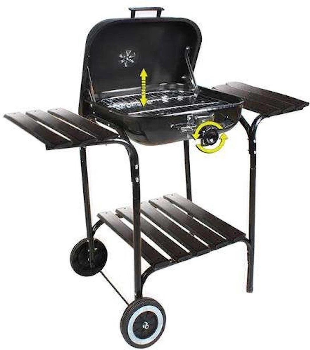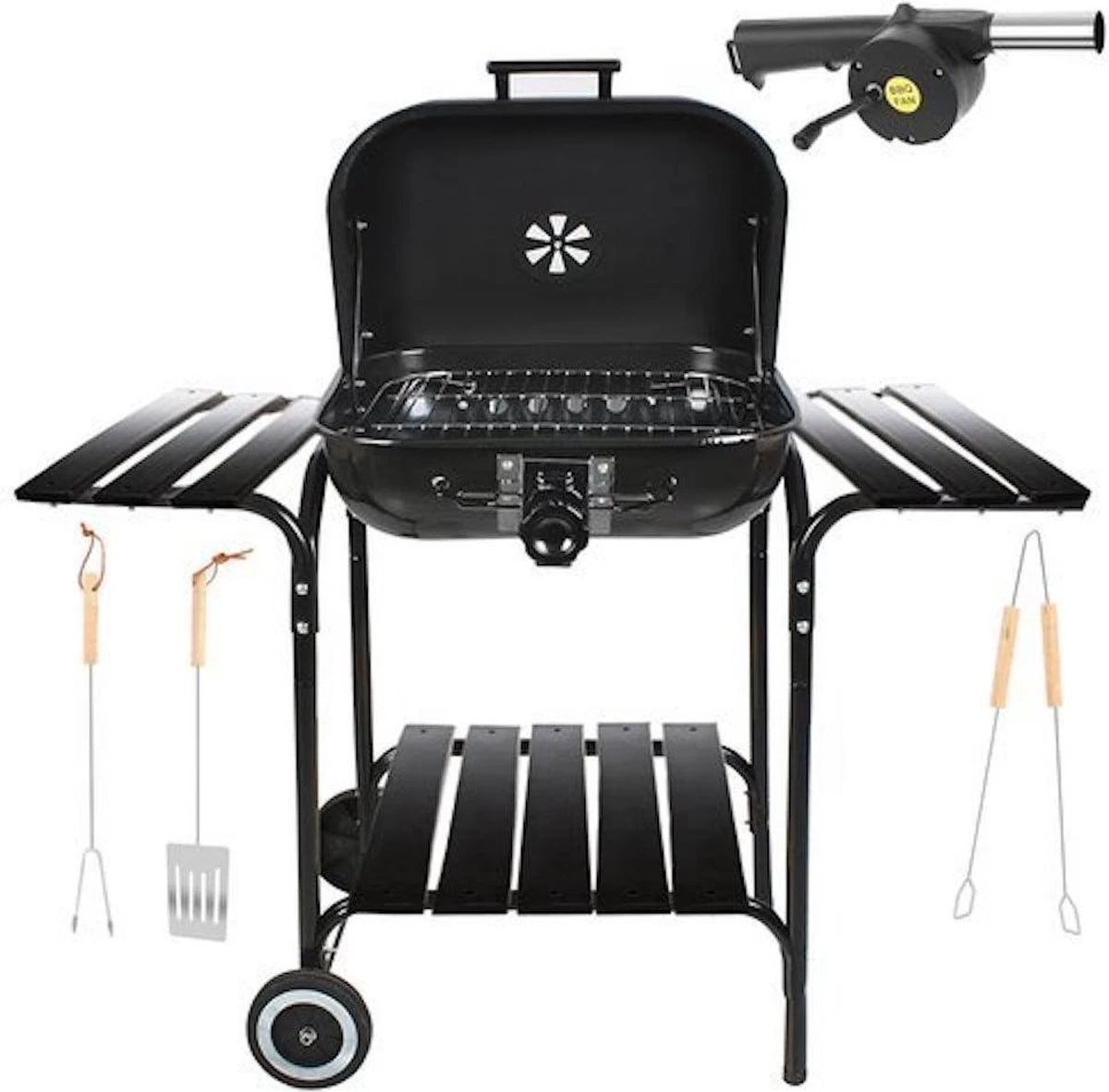 Grâce à sa conception légère avec roues conviviales, la cuisine extérieure est facile à déplacer sur votre terrasse et avec la table d’appoint, vous pouvez facilement garder votre viande à portée de main. De plus, des spatules et des pinces sont fournies avec le barbecue, pour que vous puissiez immédiatement commencer à griller ! De plus, le barbecue au charbon de bois est livré avec un ventilateur afin que vous puissiez facilement chauffer vos braises et ainsi démarrer rapidement le barbecue.