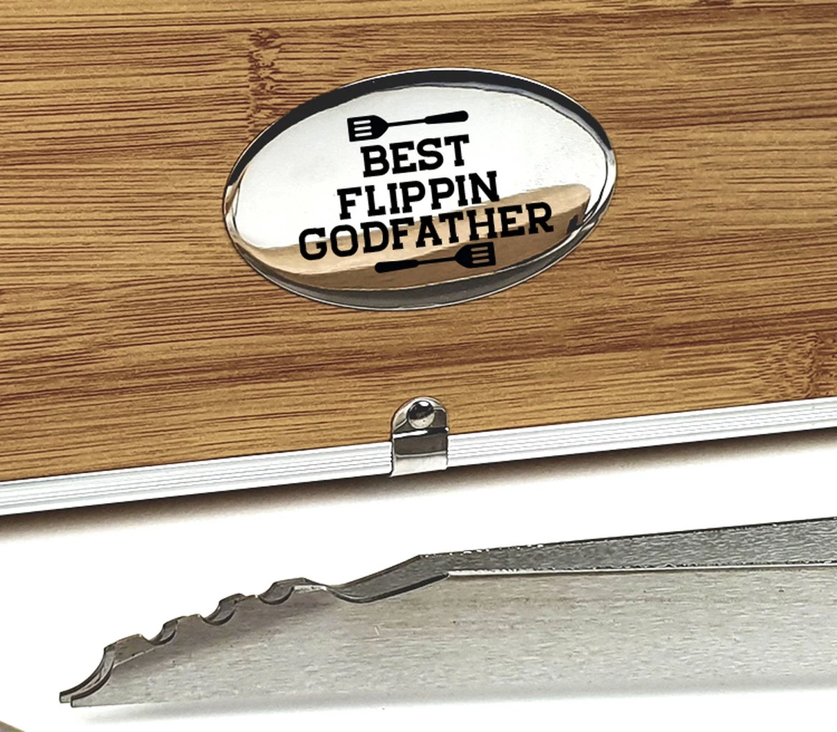 Boîtier en métal avec impression d’aspect bois tout autour, avec incrustation noire douce à l’intérieur et bandes velcro pour fixer les outils de BBQ.
