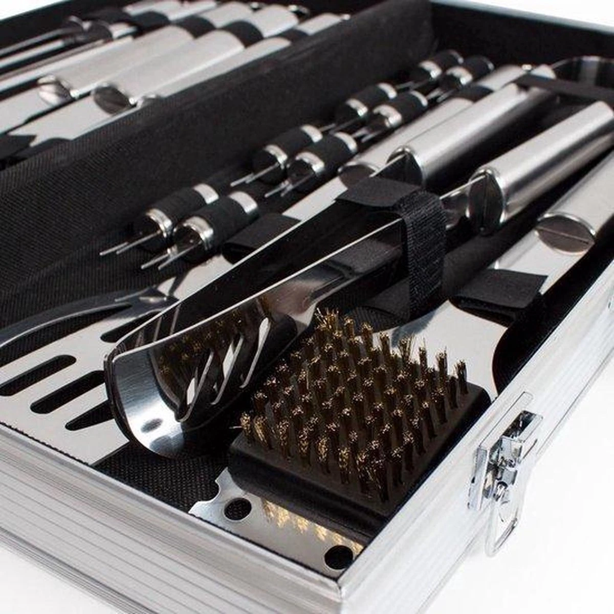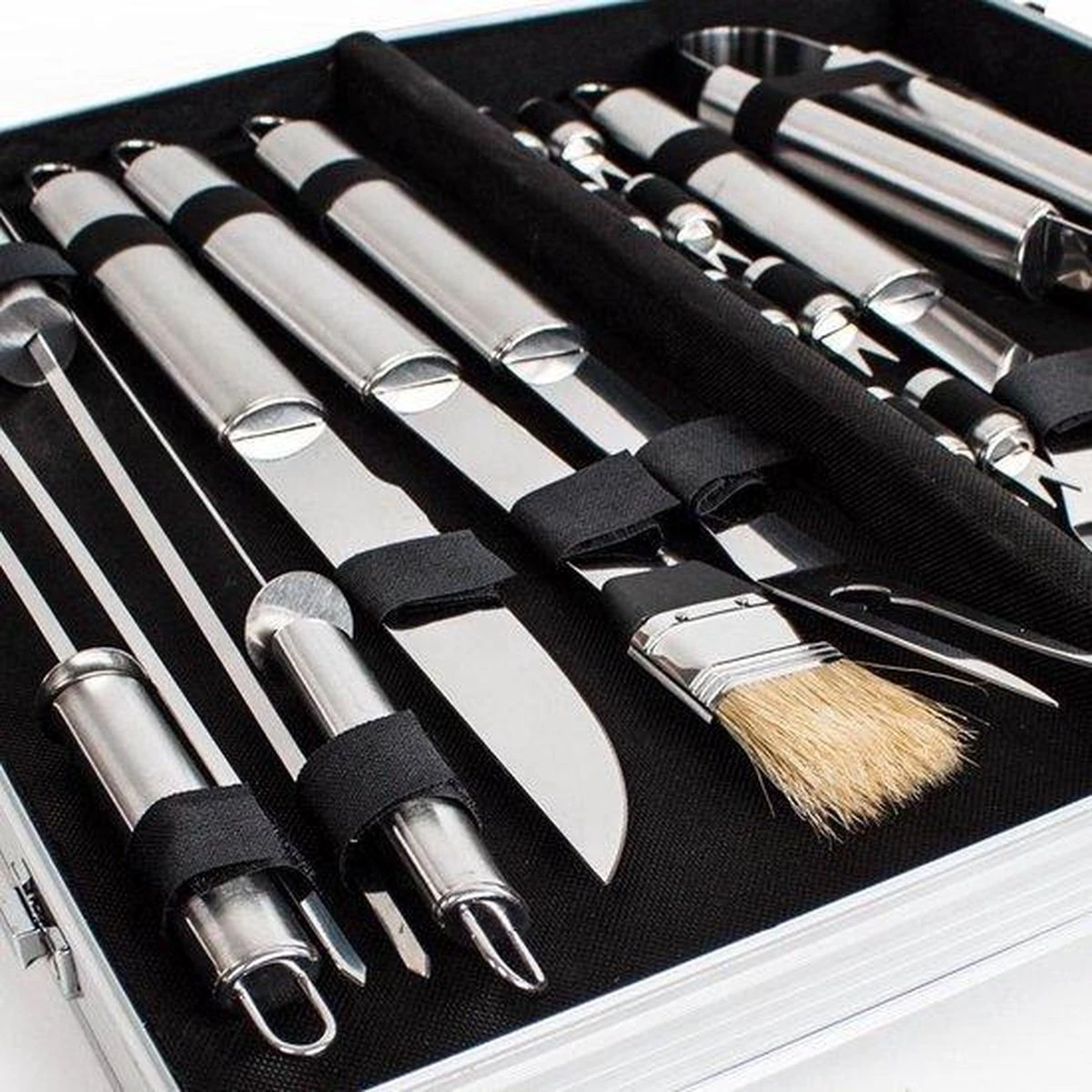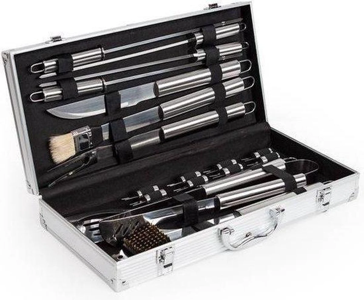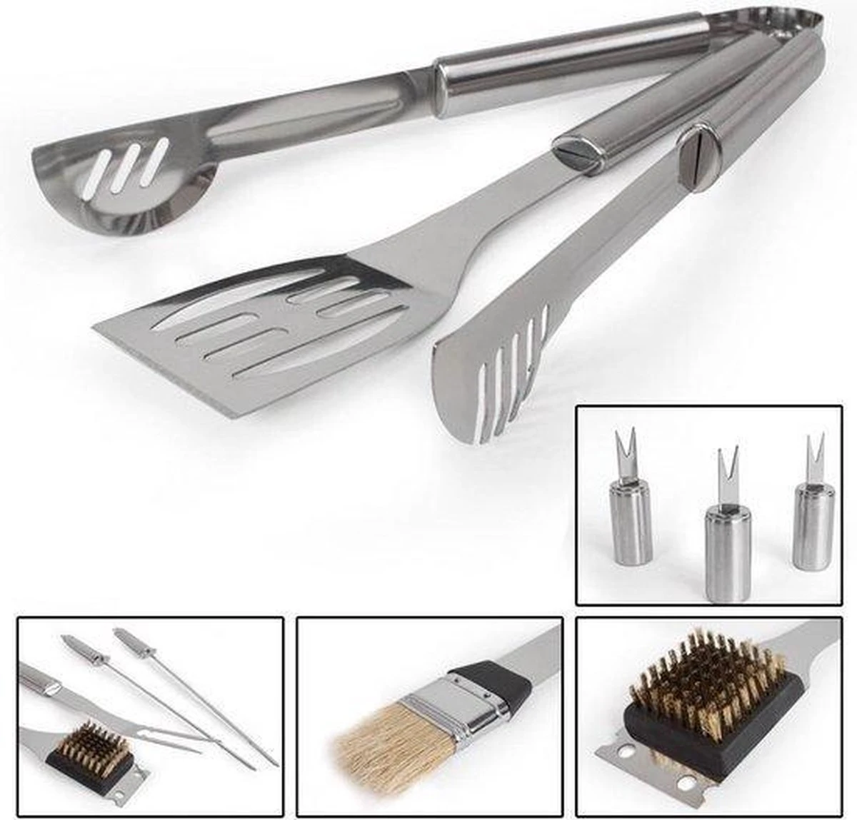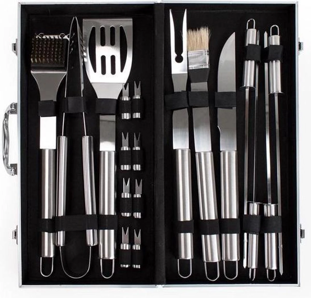 Ce boîtier en aluminium contient des outils idéaux pour griller sur un gril ou un gril. Il contient tous les éléments dont vous avez besoin: spatule, pinces, pinceau, fourchette et couteau pour une cuisson parfaite. La spatule est également munie d’un décapsuleur. La brosse a des poils de cuivre et un grattoir. C’est parfait pour nettoyer le treillis après la cuisson de la viande, du poisson ou du maïs. La valise contient également 8 brochettes de barbecue. Toutes les pièces sont en acier inoxydable et allongées pour éviter les brûlures pendant le processus de cuisson.
