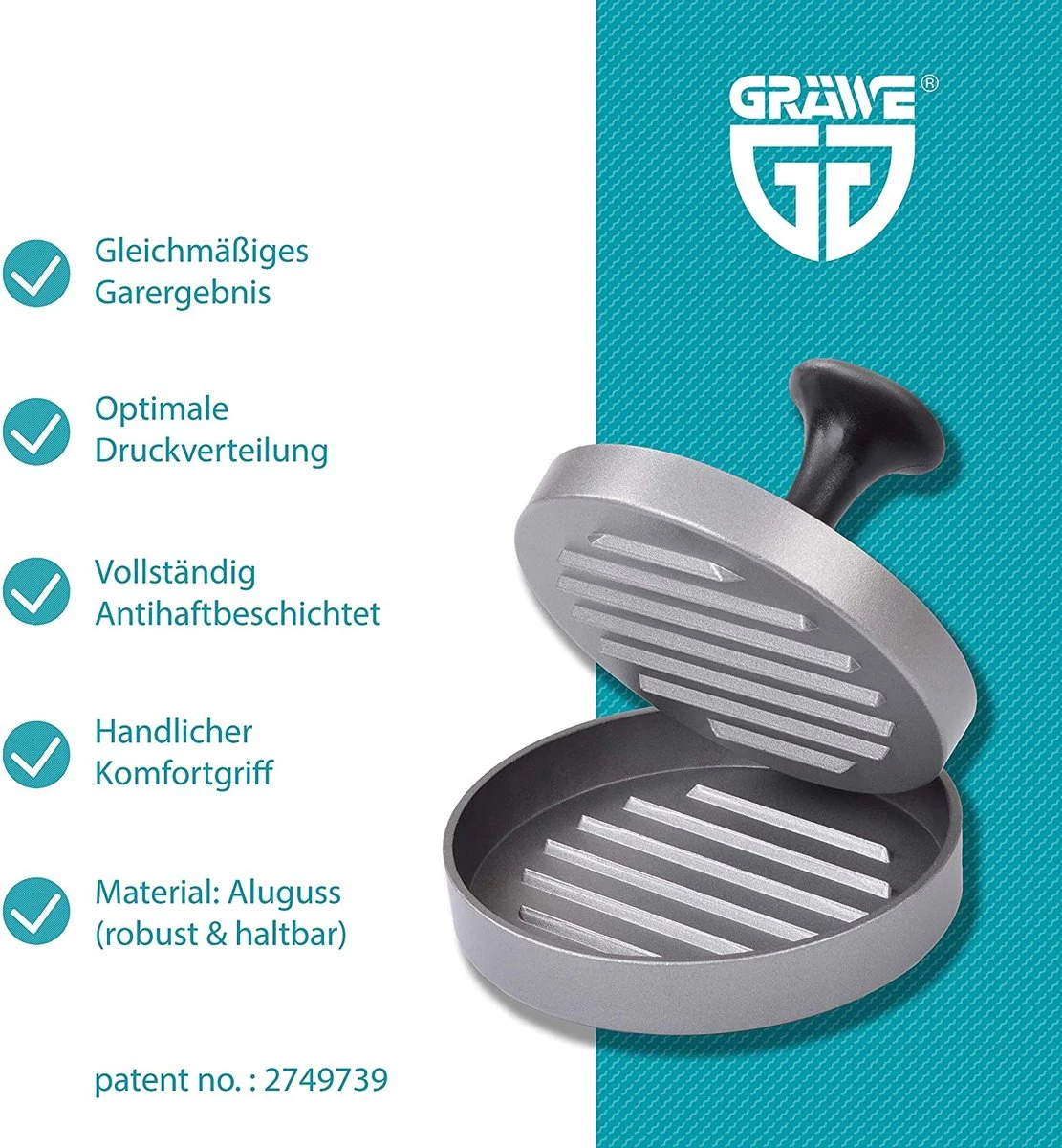 - Avec le pattypefress pratique, de savoureux hamburgers et cheeseburgers réussissent en toute simplicité. Grâce à la répartition optimale de la pression de la presse à hamburger, vos hamburgers ont toujours la forme idéale