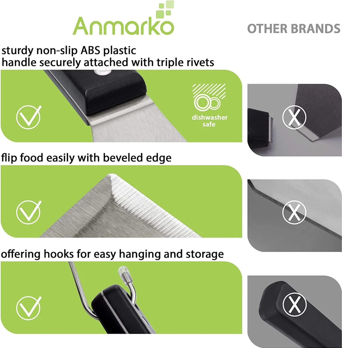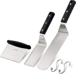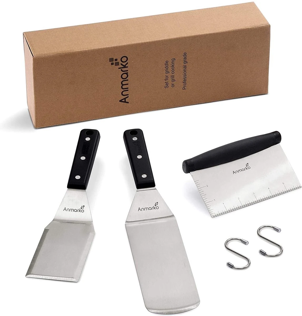 - ✅ ROBUSTE ET RÉSISTANT – l’ensemble de spatules pour plaques de cuisson est résistant. La poignée en plastique ABS est fermement fixée avec des rivets triples à la spatule en métal. Ces accessoires de gril sont conçus pour durer toute une vie. L’épaisseur du métal de la spatule pour plaque de cuisson en acier inoxydable est de 1,1 mm.