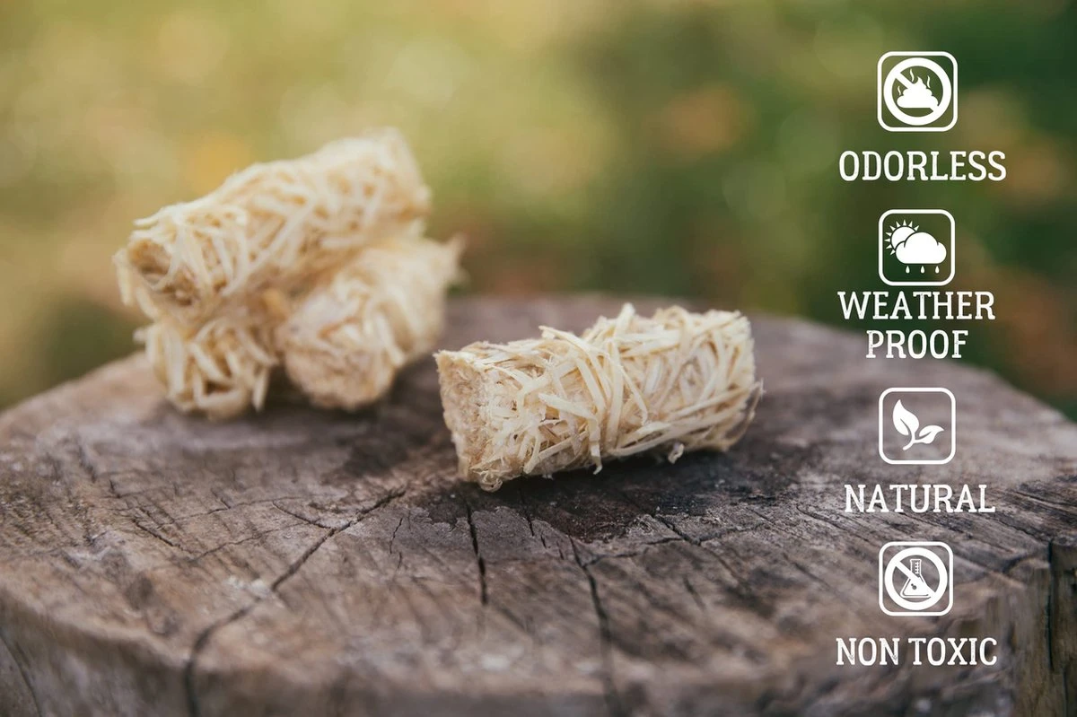 - L’allume-feu se compose de copeaux de pin naturel et de cire Safe . Grill Later ne sent pas et ne fume pas des dieux idéaux pour une utilisation intérieure et extérieure. Le matériel de cuisson est adapté.