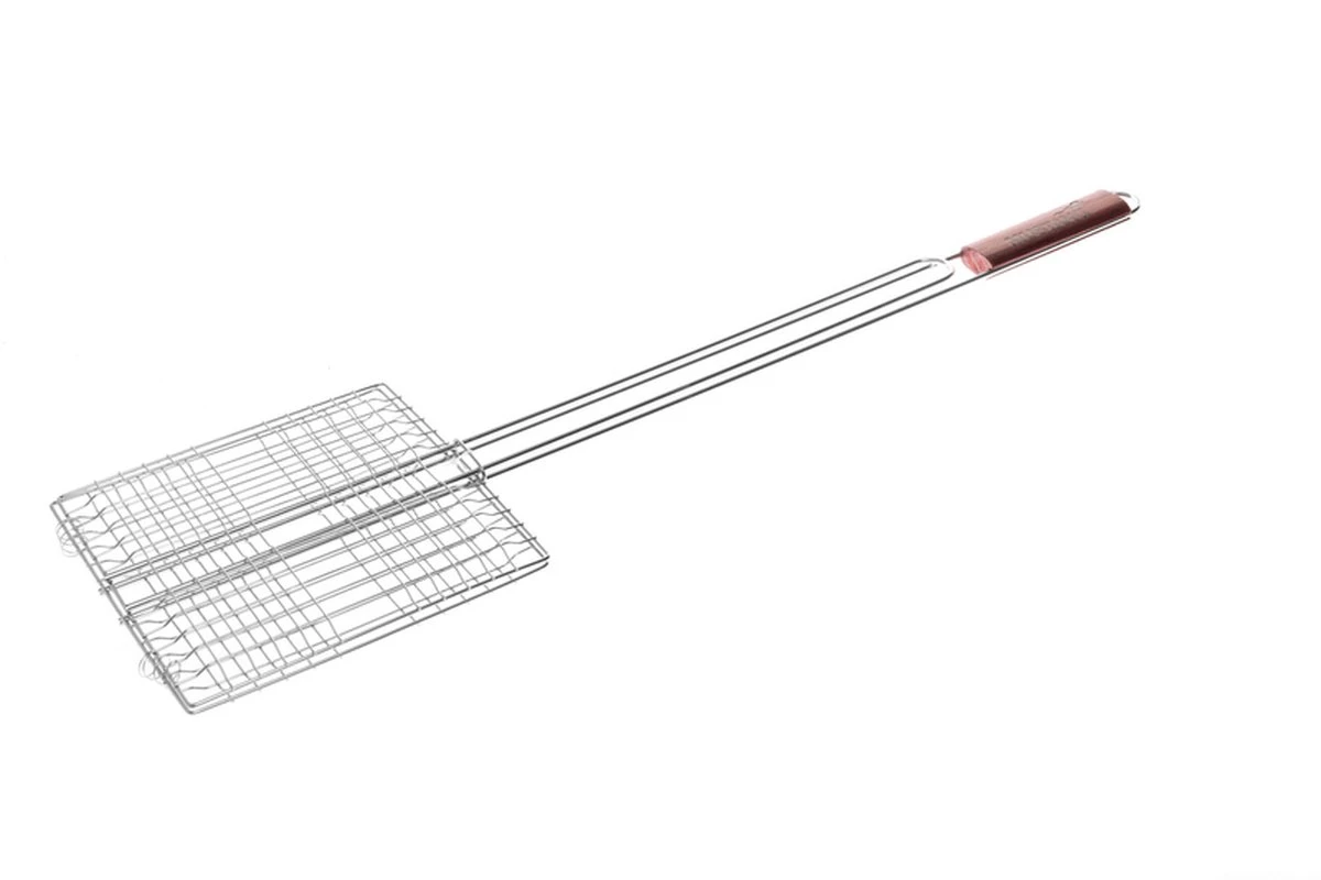 Calandre chromée avec poignée en bois avec logo Mustang . Avec une poignée extra longue pour une utilisation avec, par exemple, un feu ouvert.