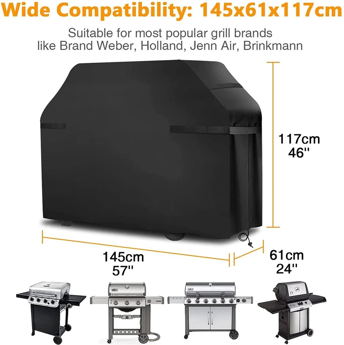 - ADAPTÉ À TOUTES LES MARQUES DE GRILS POPULAIRES : Taille du gril : 145 x 61 x 117 cm (57 »x24 »x46 »), convient à la plupart des marques de grils, telles que Weber , Holland Jenn Air Brinkmann et Char Broil.