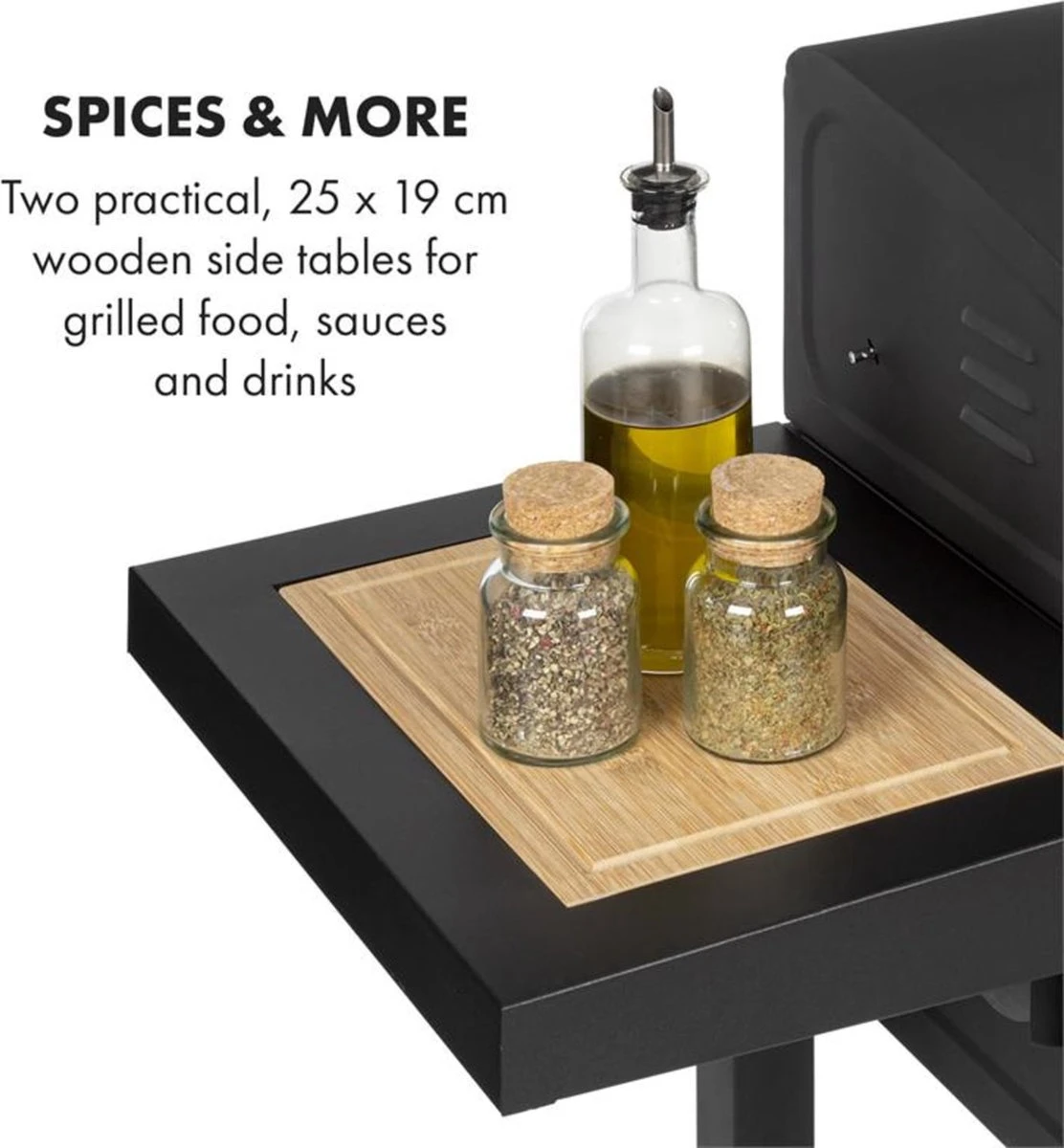 Vous pouvez également utiliser la viande pour griller et machine àKlarsteinfumer indirectementfumeur bien équipé. Ensuite, il vous suffit de fermer le couvercle, d’ajuster vos vannes à tiroir et de la fumée aromatique commence à bouillonner hors de la cheminée. Le thermomètre intégré vous aide à garder un œil sur la chaleur à l’intérieur. Grâce à la poignée cool touch, vous pouvez ouvrir le capot à tout moment pour ajouter des épices ou de la sauce. Pour vous assurer de ne rien vouloir, la machine à viande dispose de deux tables en bois pratiques à gauche et à droite. Sur les tables de 25 x 19 cm, vous pouvez placer de l’huile, des couverts de barbecue et des grillades ainsi qu’un désaltérant à portée de main. Il y a même de la place pour un sac de charbon de bois sur la grille, entre les jambes. Et lorsque vous souhaitez le déplacer, c’est très facile grâce aux deux roues.