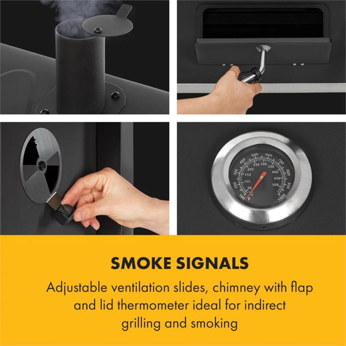 - Signaux de fumée: vannes coulissantes réglables, cheminée avec vanne et thermomètre à couvercle idéal pour griller et fumer indirectement