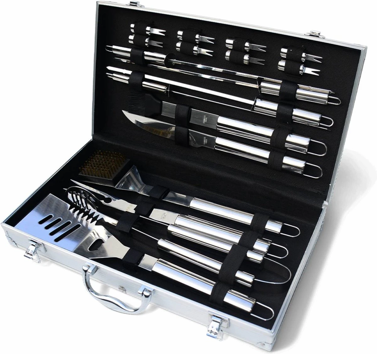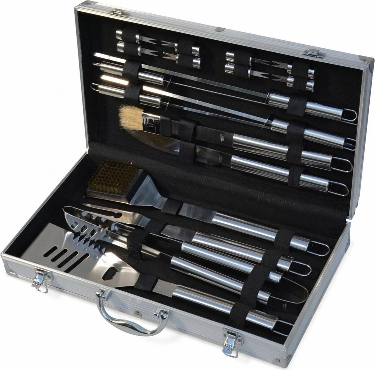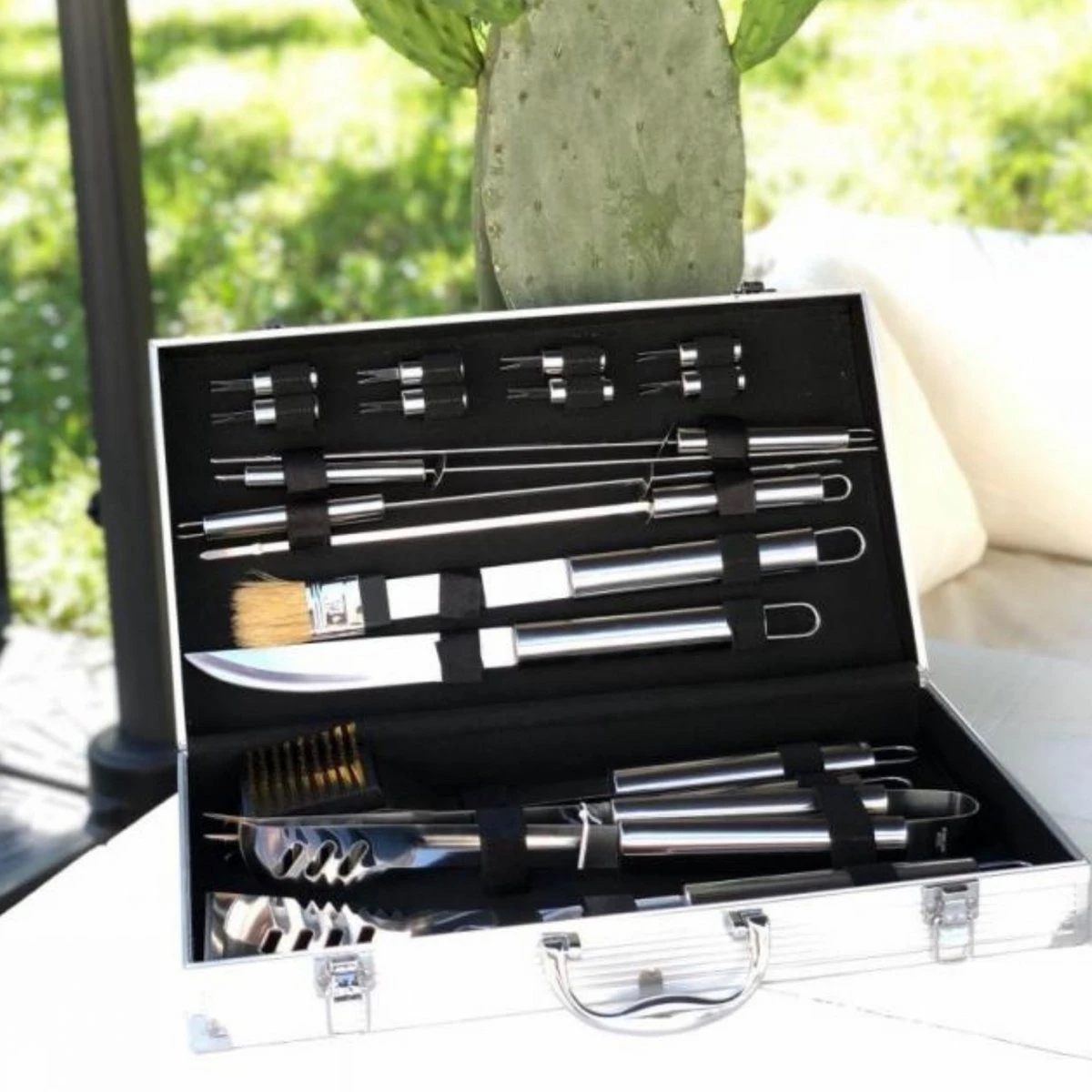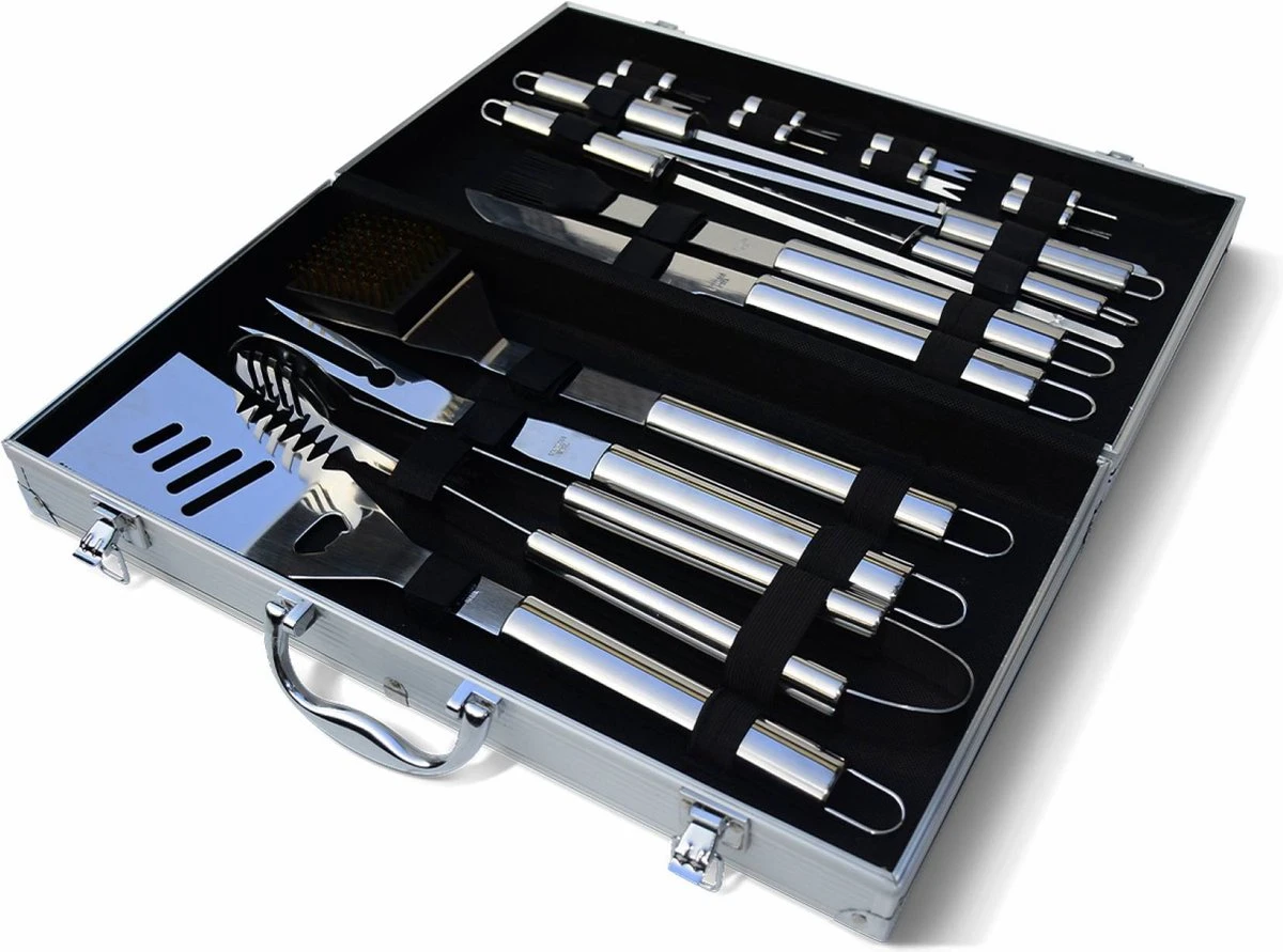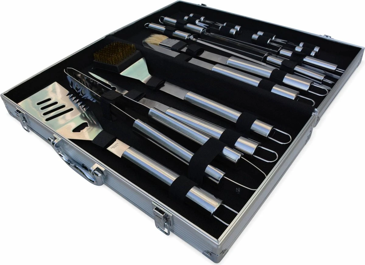 Cette mallette en aluminium contient tous les ustensiles dont vous avez besoin pour faire des grillades sur un barbecue ou une plancha. Elle comprend 18 accessoires :