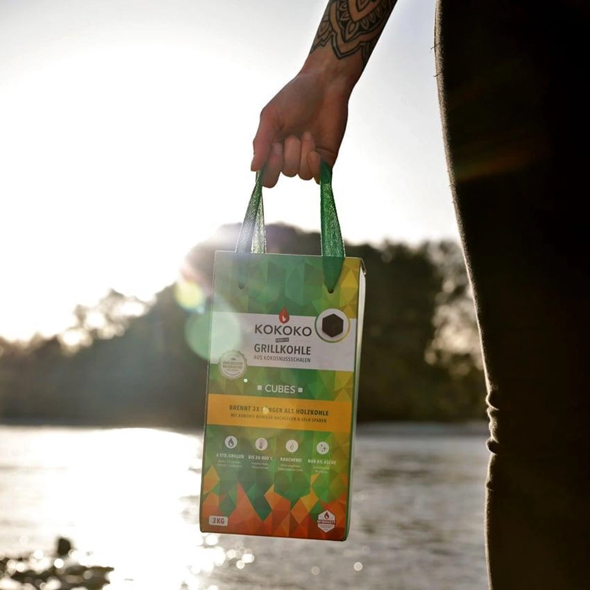 Les briquettes de noix de coco KOKOKO CUBES dans l’emballage pratique de 3 kg ont un trou. Le trou au milieu fournit l’apport d’oxygène nécessaire et donc une belle lueur constante.