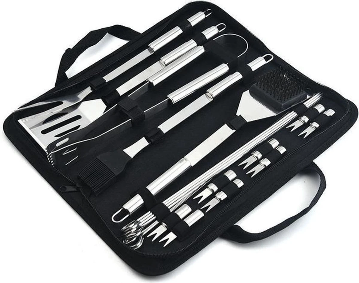 Diverse outils L’ensemble se compose d’une pince à viande, d’une spatule pour BBQ , d’une brosse, d’une fourchette à viande, d’une brosse pour nettoyer le barbecue et bien plus encore ! L’ensemble est adapté pour les hamburgers, les côtes levées, la poitrine, le steak, le poulet, le porc, le poisson et bien d’autres plats délicieux !
