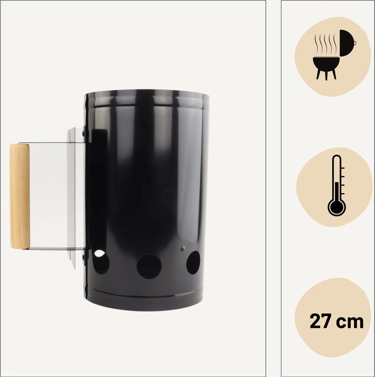L’allume-briquettes Orange85 assure un allumage sans effort des barbecues au charbon de bois. Le produit a une couleur noire et est en métal. Le démarreur de briquettes a les dimensions suivantes : 27 x 17 x 27,3 cm.
