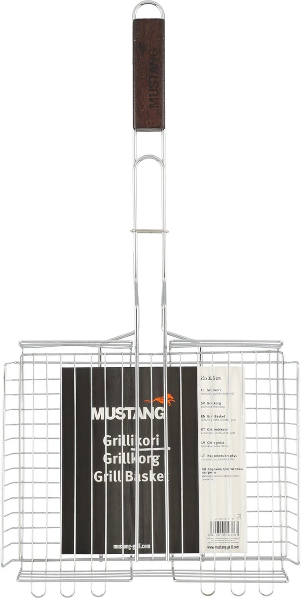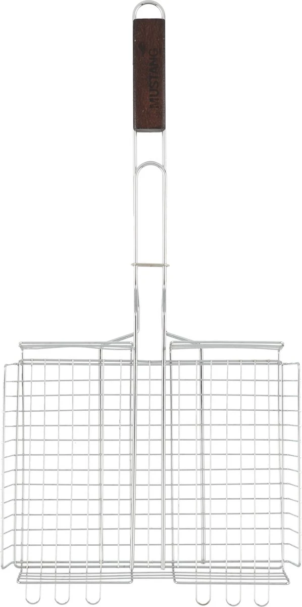 Panier grill chromé de Mustang. Facile à placer, par exemple, sur la grille grâce à la longue poignée.