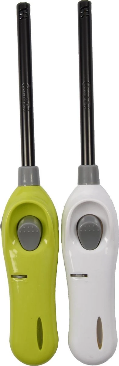 Paquet de 2 briquets barbecue / briquets à gaz Vert / Wit 26 cm. Ce briquet rechargeable avec poignée colorée a une longueur d’environ 26 cm. Vous pouvez régler vous-même la taille de la flamme et il y a une sécurité enfant sur les briquets. Cuisinière à gaz/barbecue/bbq/allume-bougies.