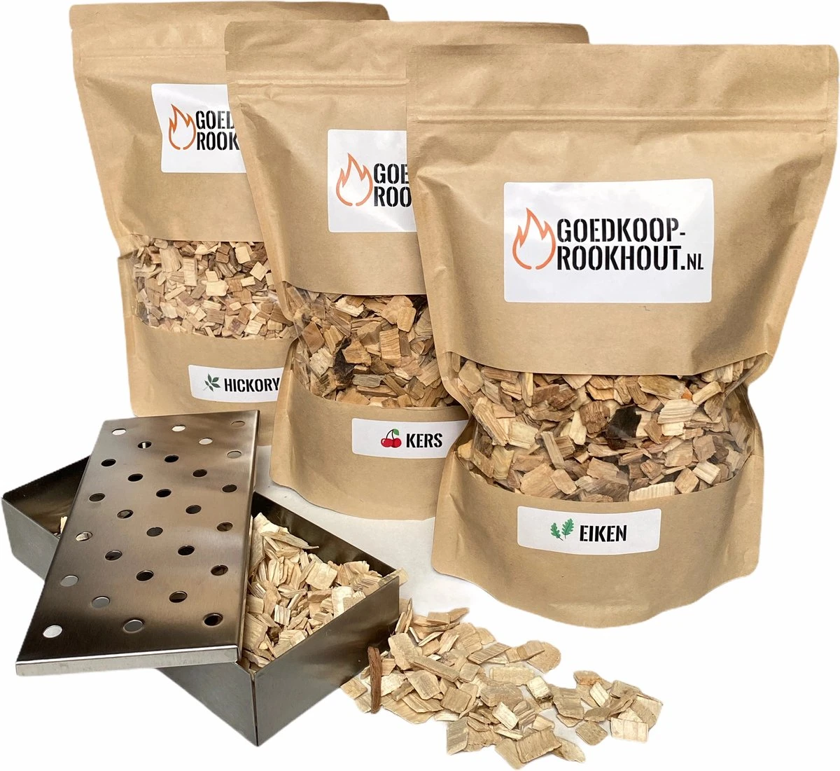 500 grammes de copeaux de fumée de hickory500 grammes de copeaux de fumée de cerise500 grammes de copeaux de fumée de chêneSmokerbox