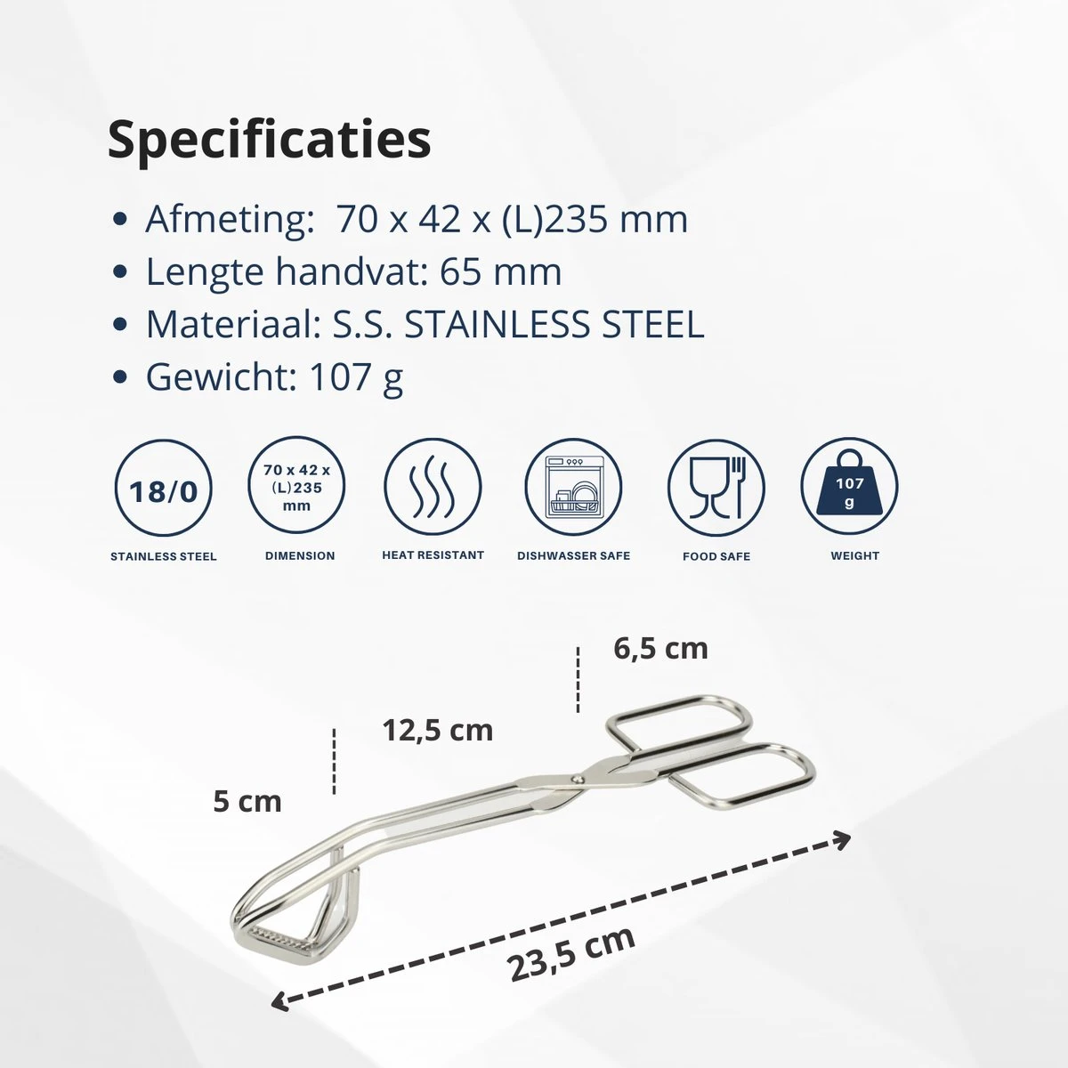 Retournez facilement votre viande dans la poêle ou servez-vous des pâtes fraîchement cuites ? Avec cette pince de cuisine universelle de Veluw, vous avez lepinces de service parfaites dans votre cuisine. Lepinces de cuisine résistantes à la chaleur est réalisée enacier inoxydable de haute qualité et équipé d’une fonction charnière. Perfect pour tous les joursusage intensif dans lecuisine professionnelle ou dans la cuisine à la maison. Lave-vaisselle .