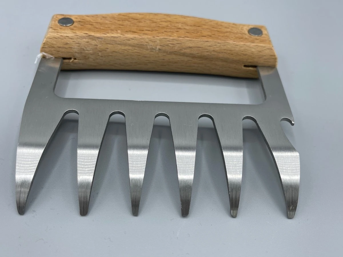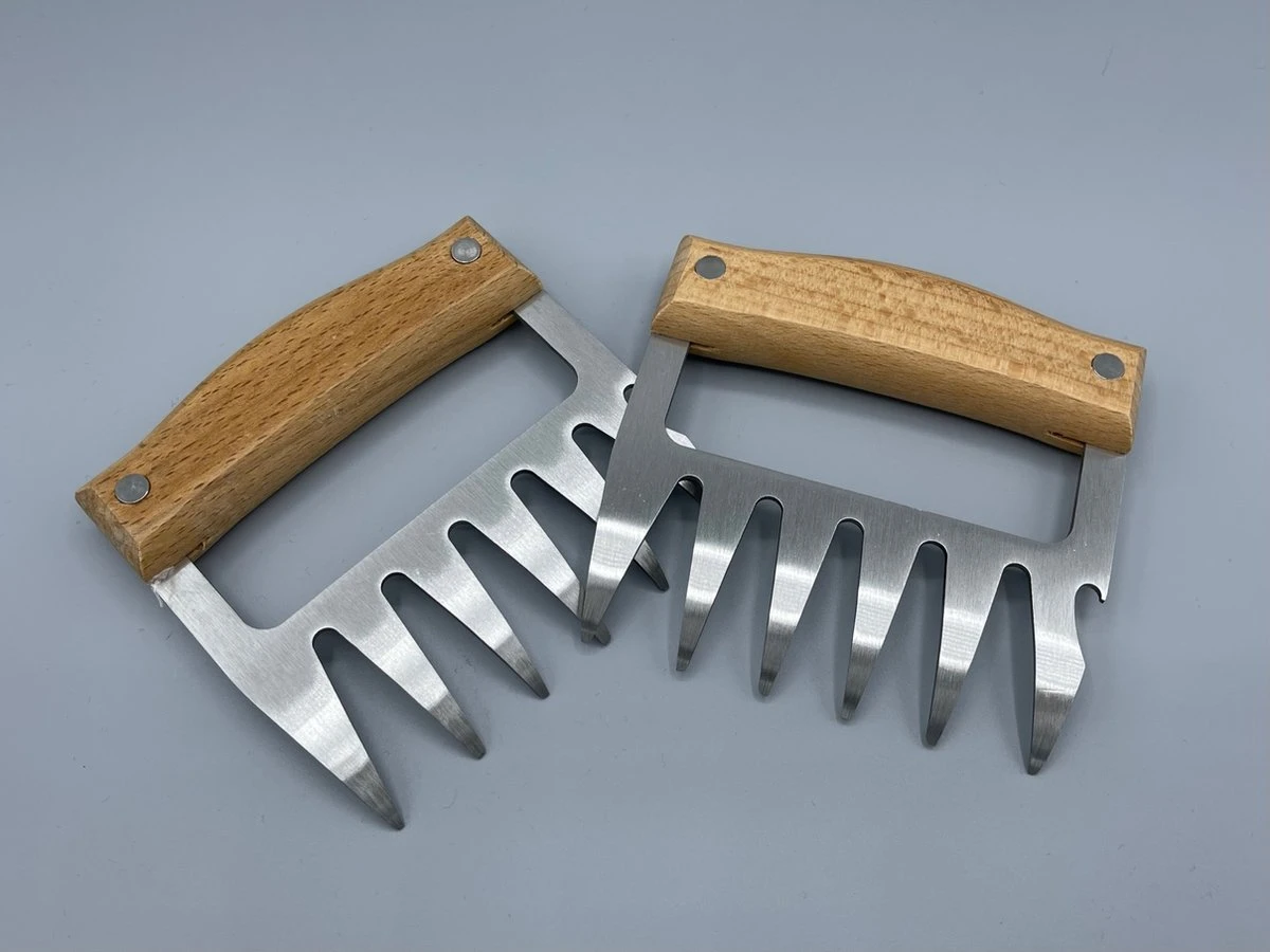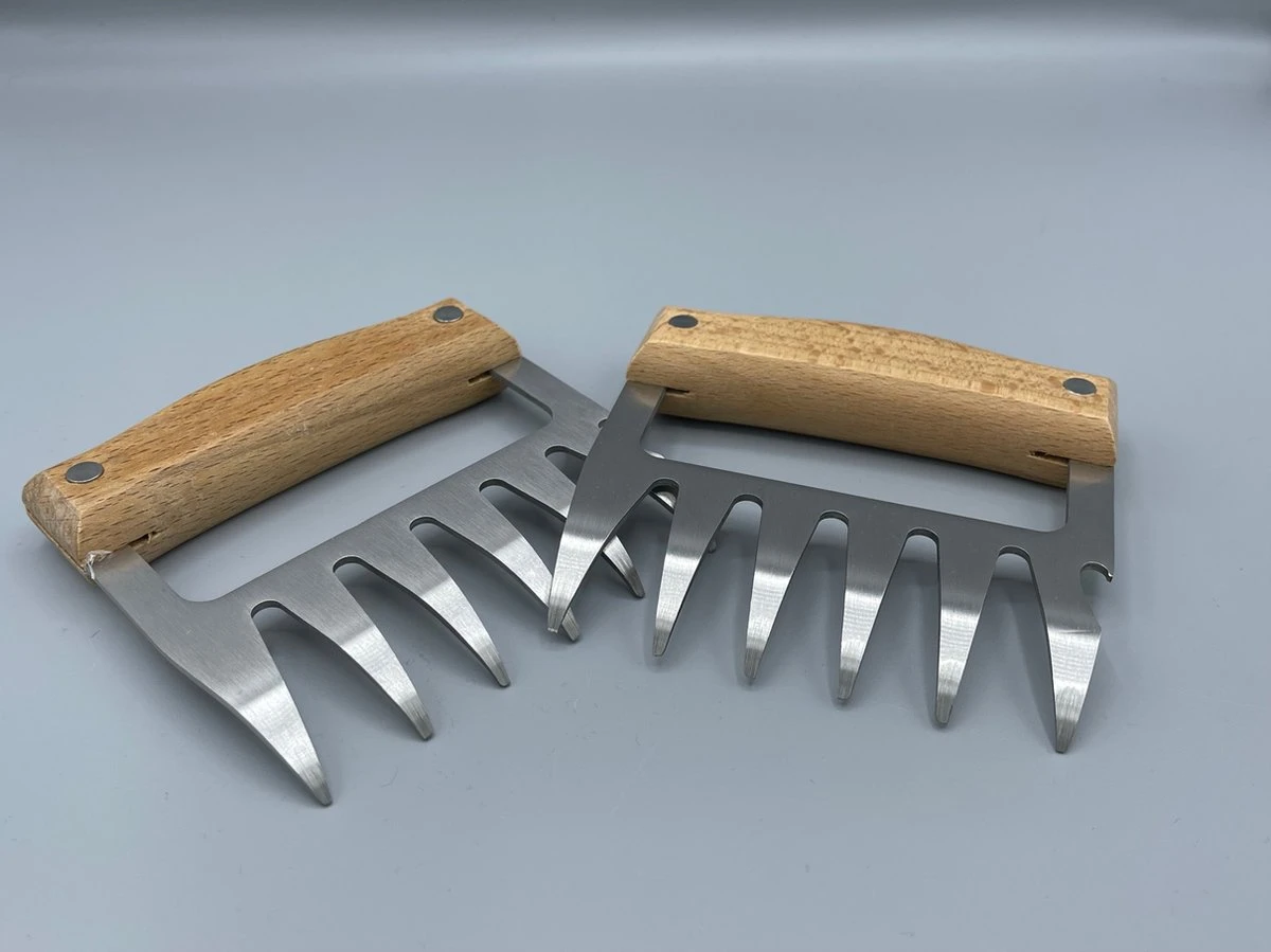 Avec ces pinces à viande avec manche en bois, vous prenez encore plus de plaisir à préparer la viande ! L’ensemble contient 2 griffes, qui sont faites de bois durable et d’acier inoxydable. Grâce aux dents acérées des griffes, vous avez séparé la viande en un rien de temps.