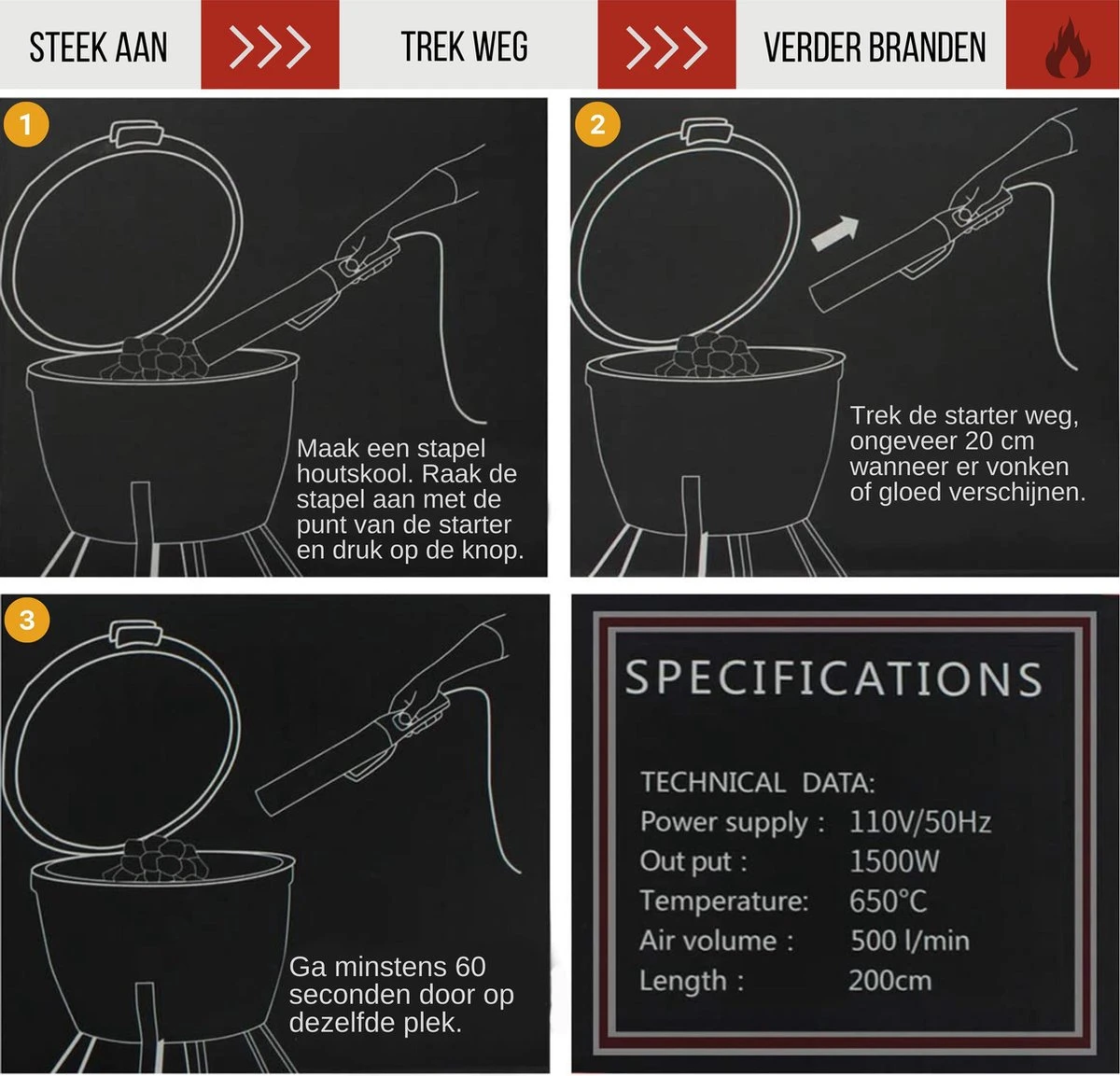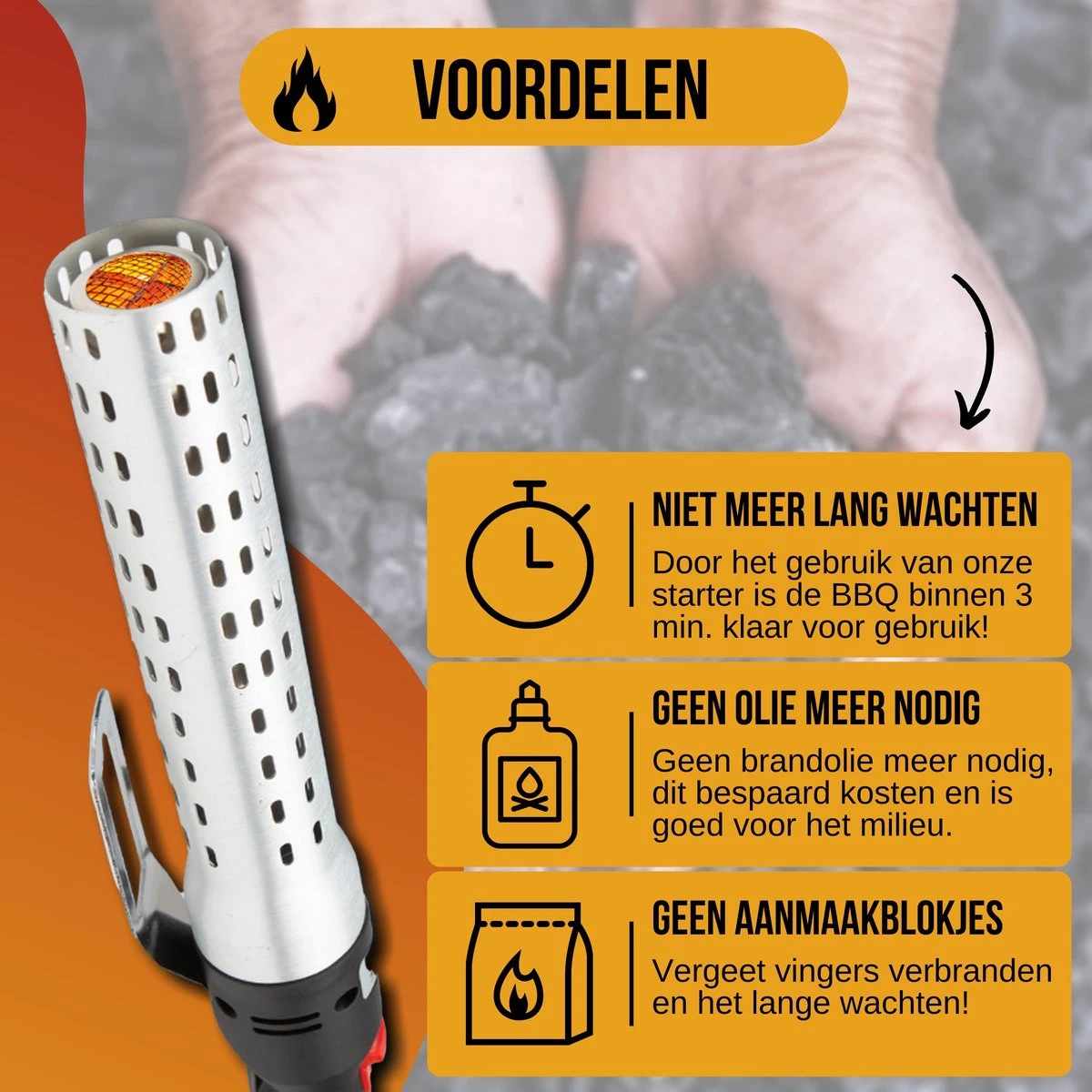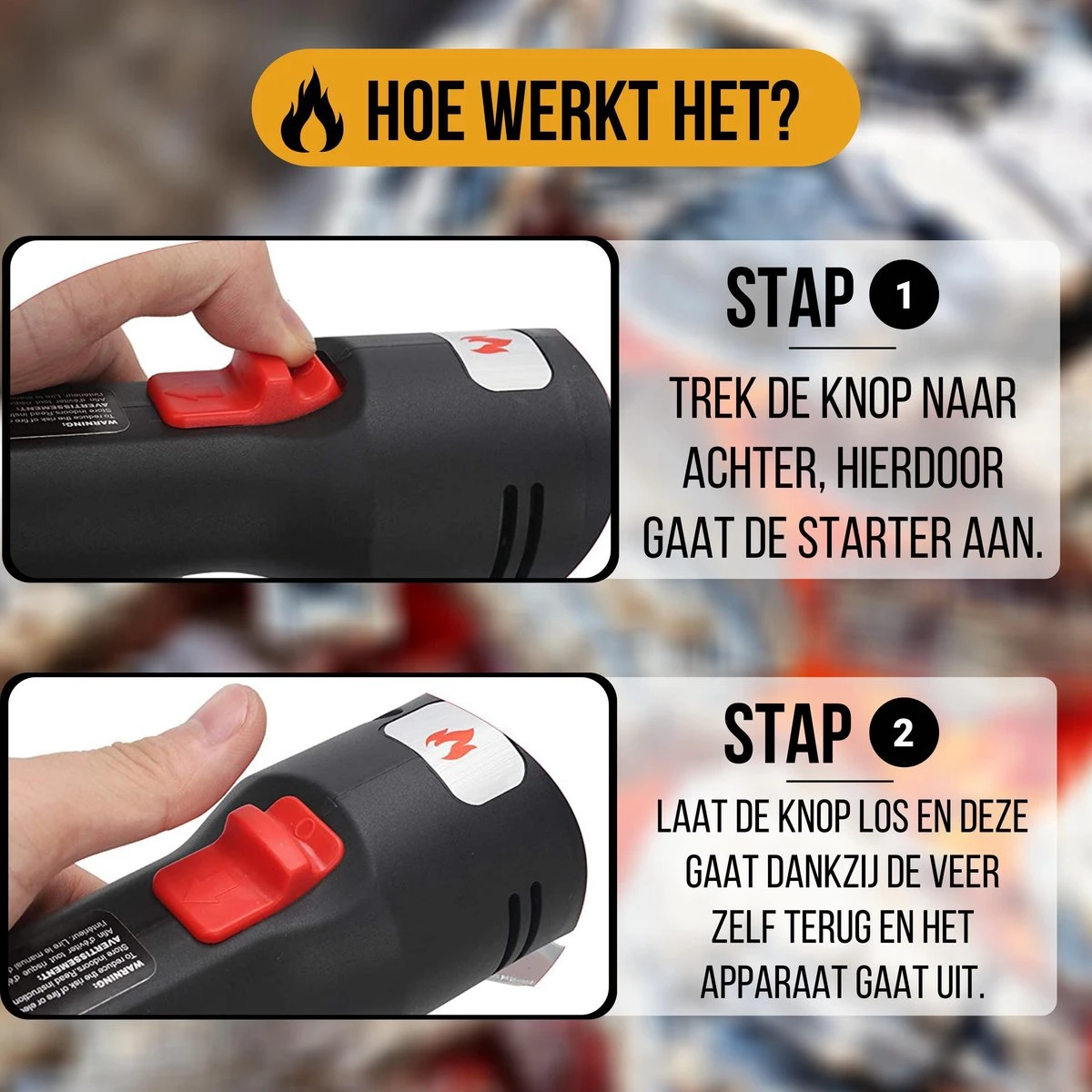 Dès que vous appuyez sur le bouton rouge, de l’air extrêmement chaud sort du Looftlighter. Vous ne tenez pas simplement l’extrémité du Looftlighter contre les charbons jusqu’à ce qu’ils brillent. Ce qui arrivera en quelques secondes. Avec les premières étincelles, vous pouvez tirer le Looftlighter 10/15 cm vers l’arrière tout en maintenant le bouton enfoncé. Le flux d’air chaud garantit que vous avez déjà des charbons rougeoyants après une minute. Si vous continuez à appuyer sur le bouton, le point lumineux deviendra plus grand. Le résultat est un barbecue chaud complet en 3 minutes.
