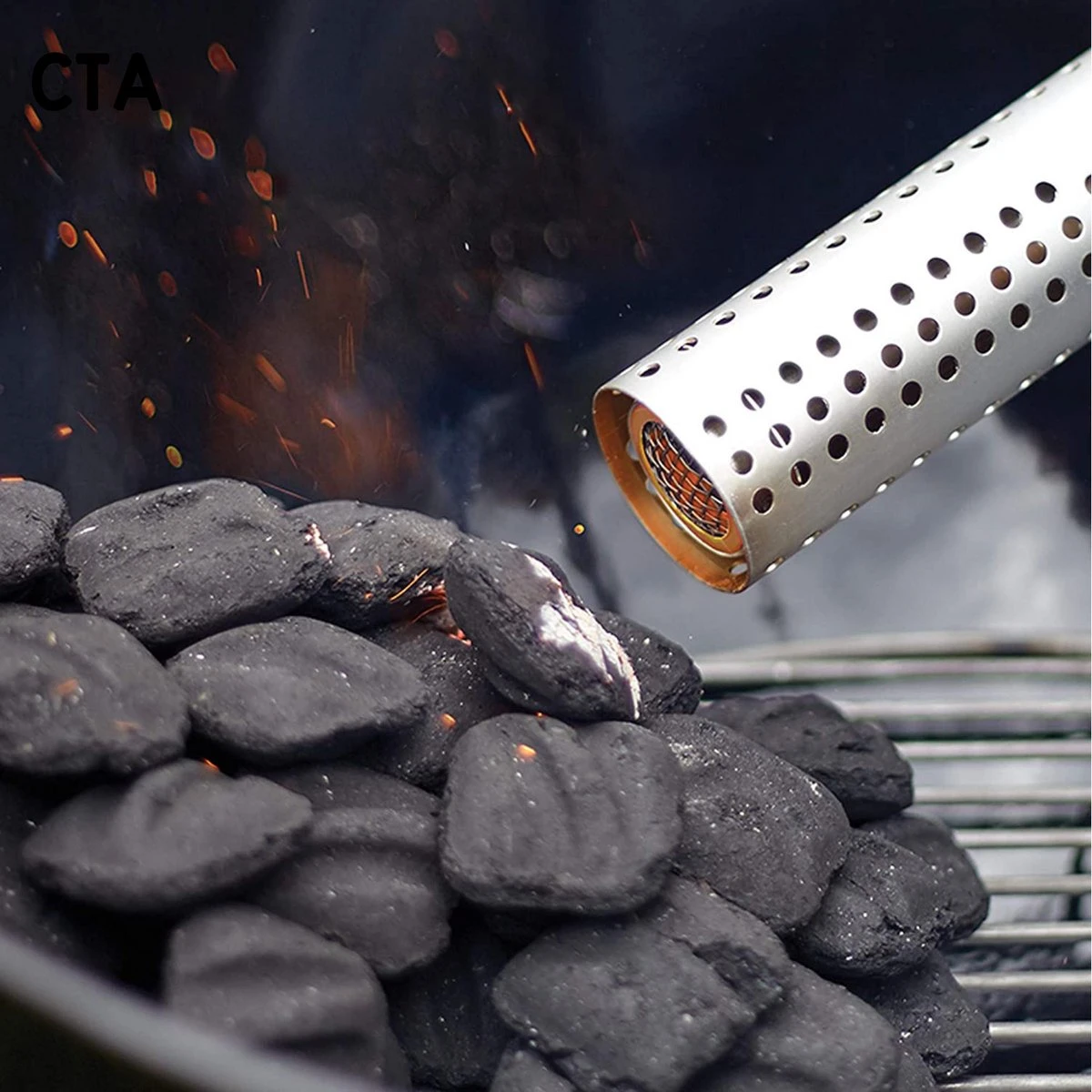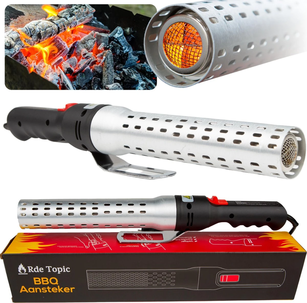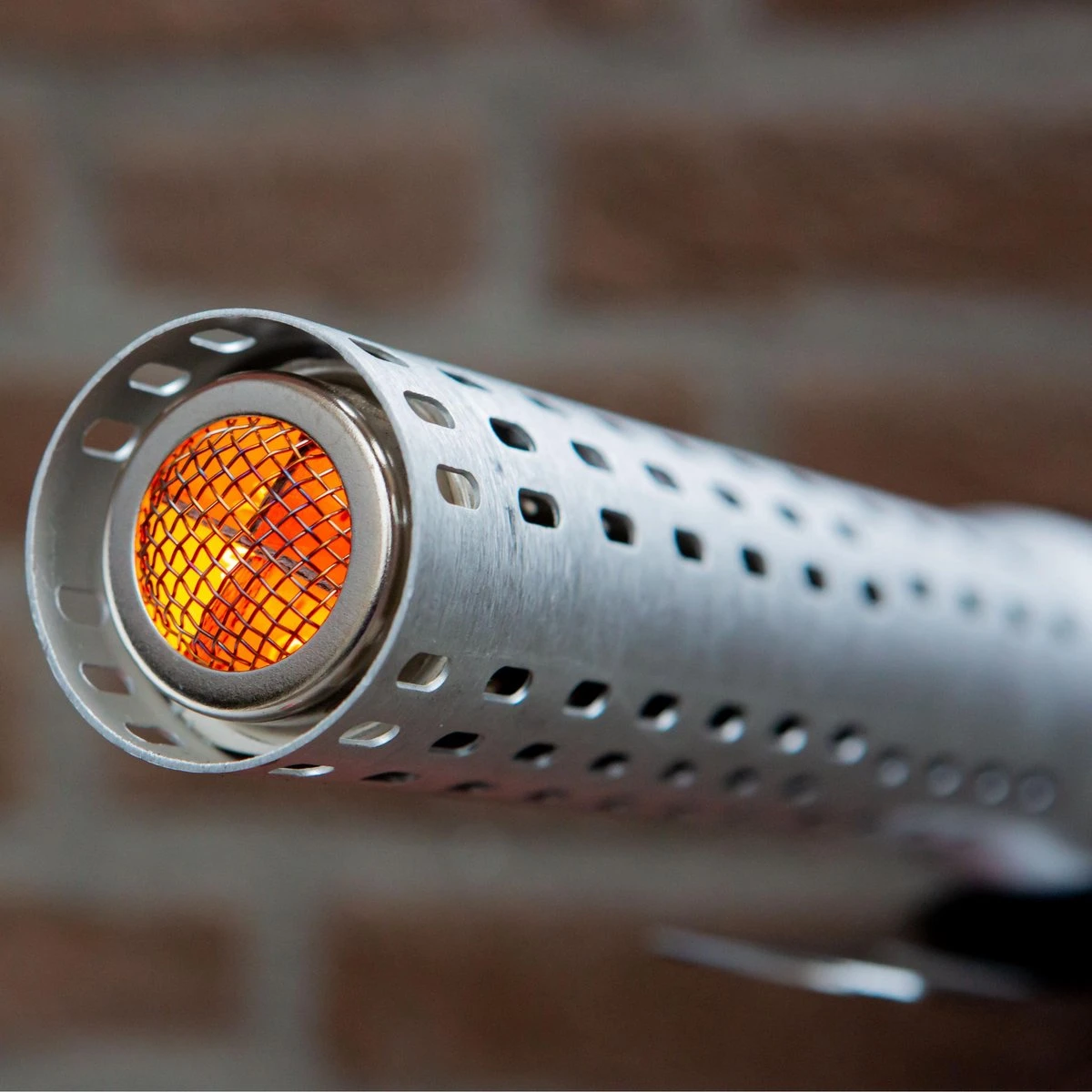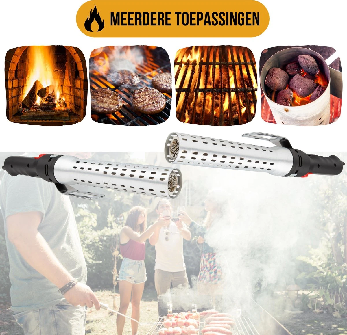 Dès que vous appuyez sur le bouton rouge, de l’air extrêmement chaud sort du Looftlighter. Vous ne tenez pas simplement l’extrémité du Looftlighter contre les charbons jusqu’à ce qu’ils brillent. Ce qui arrivera en quelques secondes. Avec les premières étincelles, vous pouvez tirer le Looftlighter 10/15 cm vers l’arrière tout en maintenant le bouton enfoncé. Le flux d’air chaud garantit que vous avez déjà des charbons rougeoyants après une minute. Si vous continuez à appuyer sur le bouton, le point lumineux deviendra plus grand. Le résultat est un barbecue chaud complet en 3 minutes.