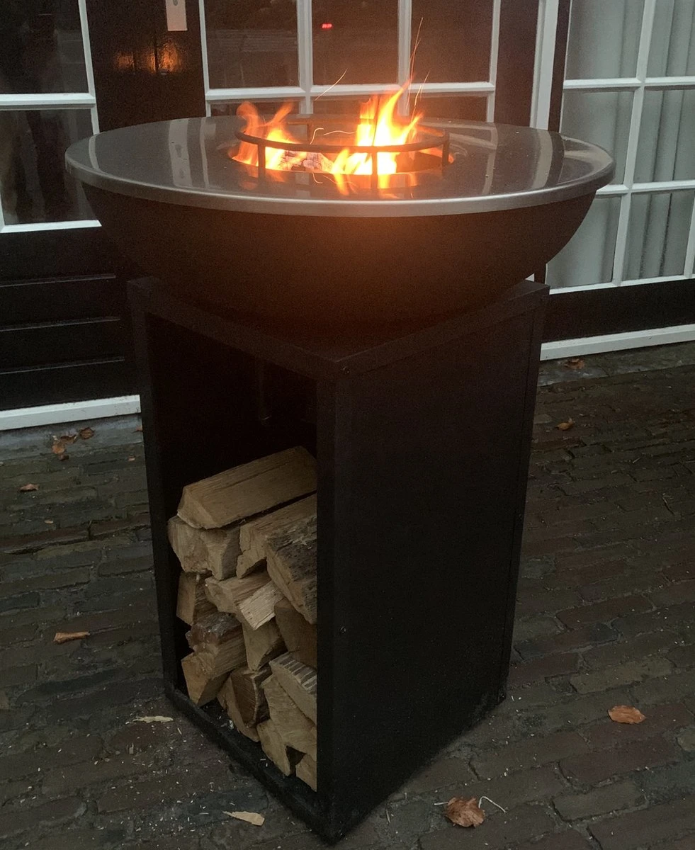 Avec une hauteur idéale de 95 cm, vous pouvez l’utiliser comme brasero. Grâce à sa forme et à sa plaque supérieure en acier inoxydable, il dégage beaucoup de chaleur et une belle vue depuis votre table à manger ou votre salon de jardin. Vous pouvez facilement retirer la plaque en acier inoxydable, mais ce n’est pas nécessaire. Grâce au rangement à bois pratique, vous avez toujours du bois à portée de main et il est également très beau. Voir les photos ou la vidéo.